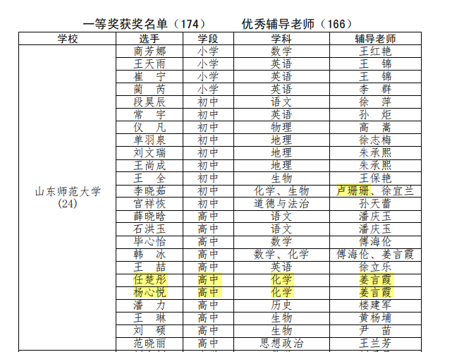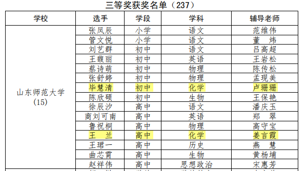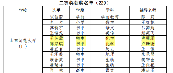 近日,山东省教育厅印发《关于公布第十届山东省师范类高校学生从业技能大赛获奖名单的通知》(鲁教学函〔2023〕3 号),我院2019级本科生在本届大赛中表现突出,取得优异成绩。其中,任楚彤、杨心悦获高中化学一等奖,王芙蓉、陈家琪获初中化学二等奖,毕慧清、王兰分获初中和高中化学三等奖,卢姗姗、姜言霞两位教师获优秀辅导教师奖。