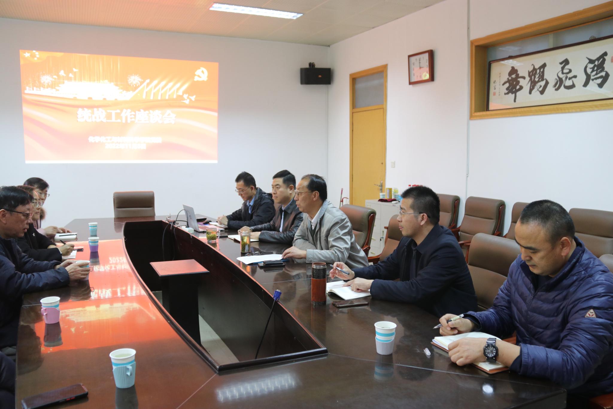 11月8日下午,化学化工与材料科学学院党委于千佛山校区一教1246会议室召开统战工作座谈会。学院党委书记王金山,副书记孙南,党委委员崔官伟、张其坤以及学院组织员、民主党派教师代表参加座谈,会议由王金山主持。