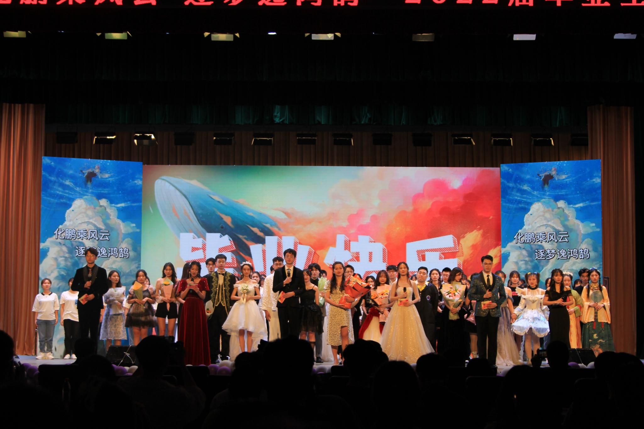 “化鹏乘风云,逐梦逸鸿鹄”2022届毕业晚会在一段对过往四年大学生活回忆的影片中拉开序幕,一张张合照记载了一个个故事,四年的青春在彼此相逢相聚间开满了清芬的花朵,会场中回荡着一种感人的氛围。随后晚会正式开始,一曲开场舞《Tomback》瞬间点燃全场。魏莱阳、裴新丽等带来的小品《减肥帮往事》讲述了“减肥帮”的减肥日记,欢笑中带我们回忆了大学生活的减肥逸事。流年似水,岁月当歌。老师们演唱的一首《光阴的故事》让我们回想起与山师的初次邂逅,那段朝夕相伴的师生情谊,那个四年风花雪月的梦。“玉壶存冰心,朱笔写师魂”老师永远是学生时代最暖的春色,是一枝开入心扉的春花。接下来窦锦全、周鹏斐的原创相声《唱跳rap》为现场的同学带来了欢声笑语,将晚会的气氛推向最高潮。去到任何想要去的地方,活出自己想成为的模样,李婉晴、贾文雨等带来的走秀表演《山师任意门》为我们打开了一扇扇关于青春、关于选择的任意门。最后是晚会的第三部分,“回望灯如旧,骊歌尚未央”。刘笛、毛陈施旖的舞台剧《不说再见》带我们回忆了大学四年的青葱岁月,即使疫情给青春带来遗憾,但我们且歌且行、携上热爱,奔赴下一场山海。“山水有相逢,春风入卷来”,毕业不说再见,相逢依旧如故。石广慧、陈晓萱等带来的歌曲串烧《不只是经过》、合唱队带来的歌曲《山师东路的日子》唱出了四年前五湖四海的会面,唱出了四年后天南海北的离别,歌声逝去,前程始于足下,岁月的流逝挥不去执着的梦,时光的飞驰也带不走永恒的心,毕业晚会在歌声中落下帷幕。