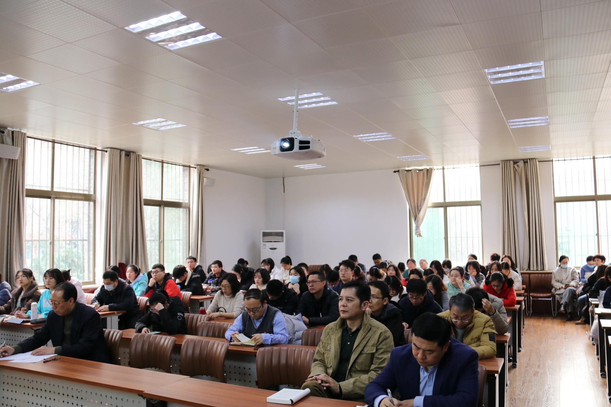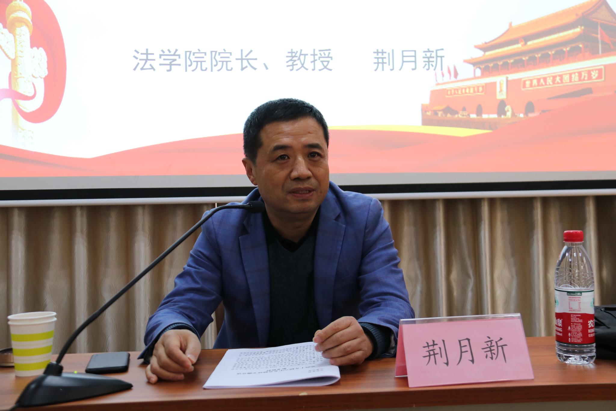 12月9日下午,学校党的十九届六中全会精神宣讲团成员、法学院院长荆月新教授来我院宣讲党的十九届六中全会精神,学院教工党员代表、学生党员代表近百人参加。宣讲会由学院党委书记王金山主持。