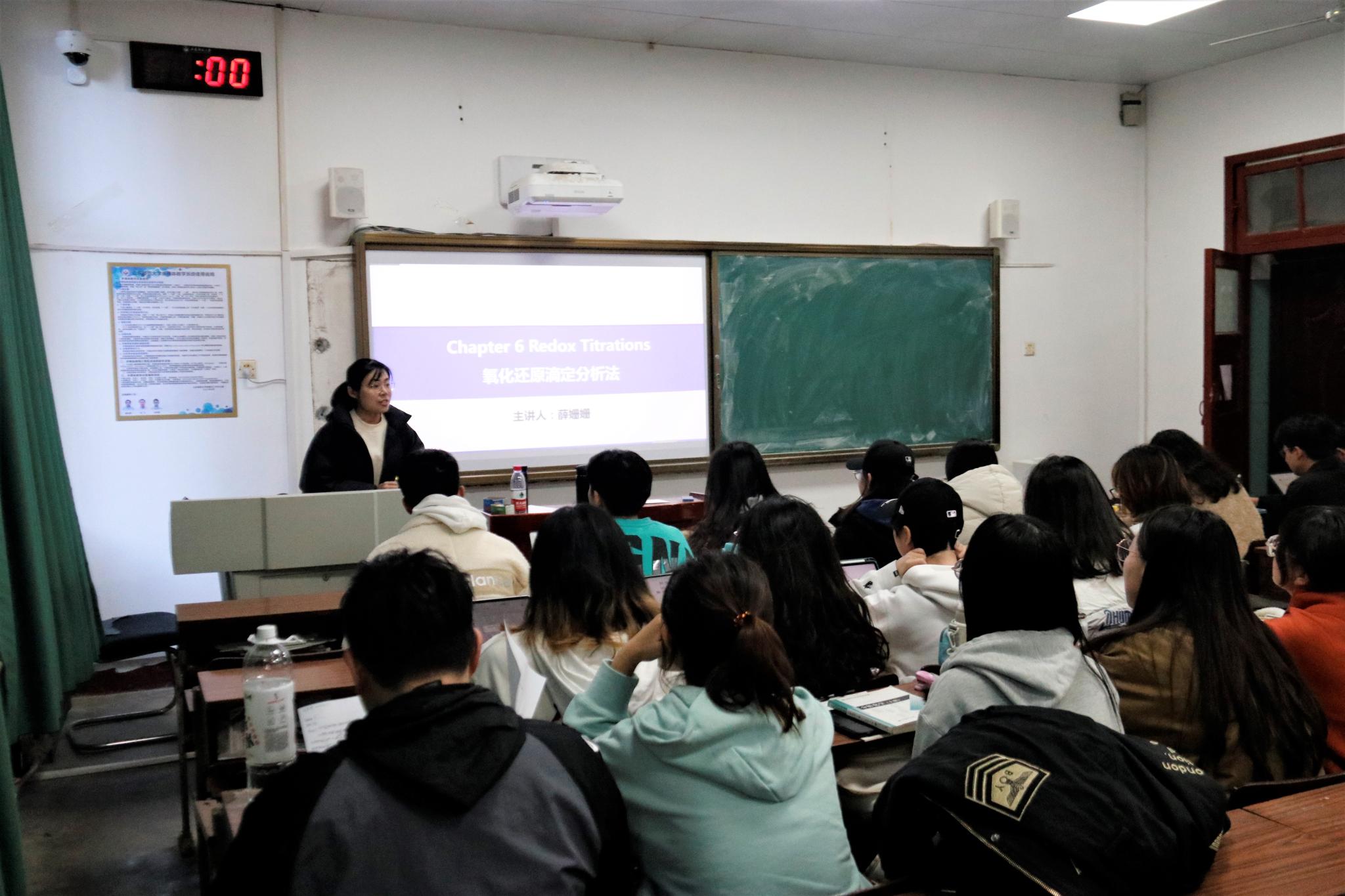 公开课是化学必修课《分析化学》第三大滴定方法—氧化还原滴定法的新授课。授课教师薛姗姗首先引导学生回忆学过的酸碱滴定和络合滴定,在此基础上,以类比的方法展开对氧化还原滴定的教学。接着从学习目标,氧化还原滴定中的基本概念、原理、影响因素及可能出现的问题等方面讲授课程。期间运用多个例子,生动细致地引导学生理解氧化还原滴定的内在机理,并结合其他学科来对知识点进行拓展。最后教师总结本节课学习内容并布置好预习内容。听课期间,各位老师记录学生们的学习情况,总结教师授课的优点和问题。