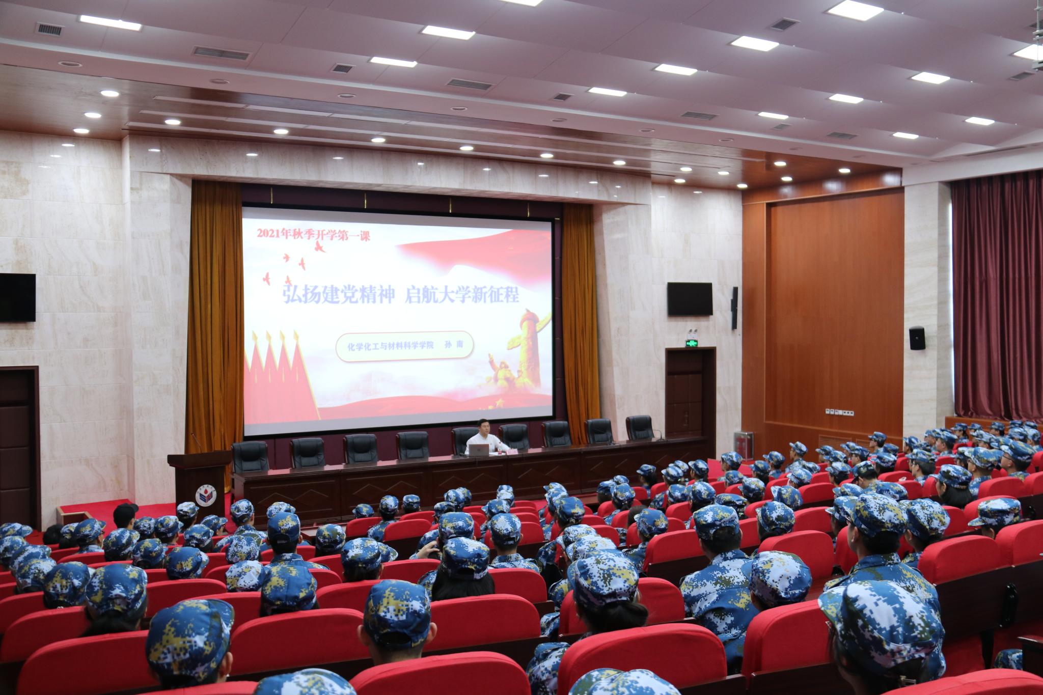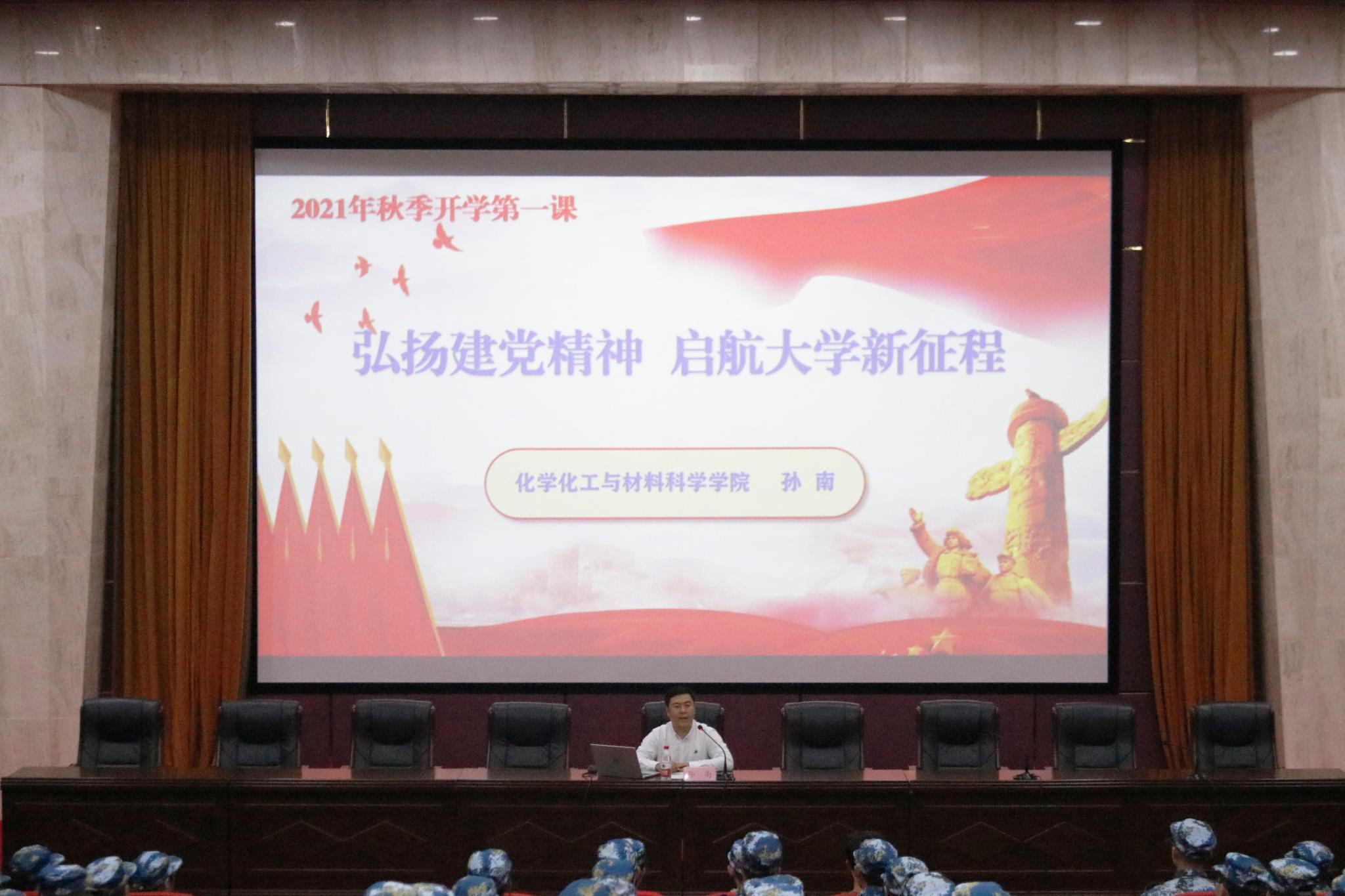 为深入学习贯彻习近平总书记“七一”重要讲话精神,教育引导新生系好大学生活的第一粒扣子,9月7日下午,化学化工与材料科学学院于教学三楼报告厅举办展开学第一课活动,由学院党委副书记孙南为2021级本科新生讲授“弘扬建党精神,启航大学新征程”开学第一课。