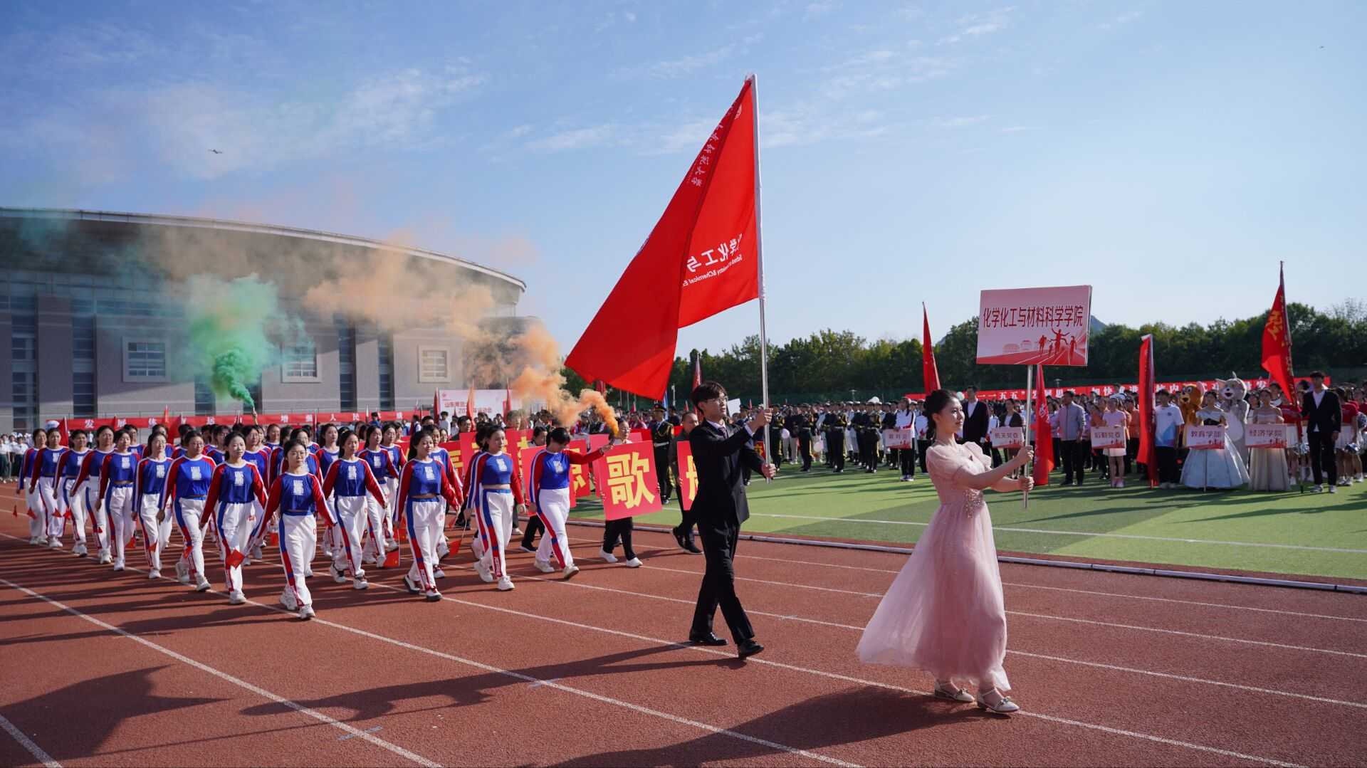 伴随着《运动会进行曲》的奏响,本次运动会拉开序幕。各个学院方队身着盛装,依次走过主席台。其中,化学院的队列以醒目的红蓝白三色服装亮相,方队步伐整齐划一,口号响亮,展现了化学院朝气蓬勃、积极向上的精神面貌。