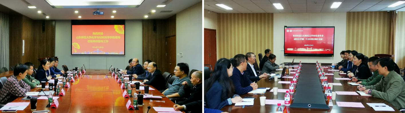 南京大学化学化工学院院长黎书华、南京师范大学化学与材料科学学院院长唐亚文分别主持召开调研座谈会,对李娜一行的到来表示热烈欢迎,简要介绍了各自学院的基本情况,期待与山东师范大学化学院进一步推进交流互动常态长效化,加强全面合作。
