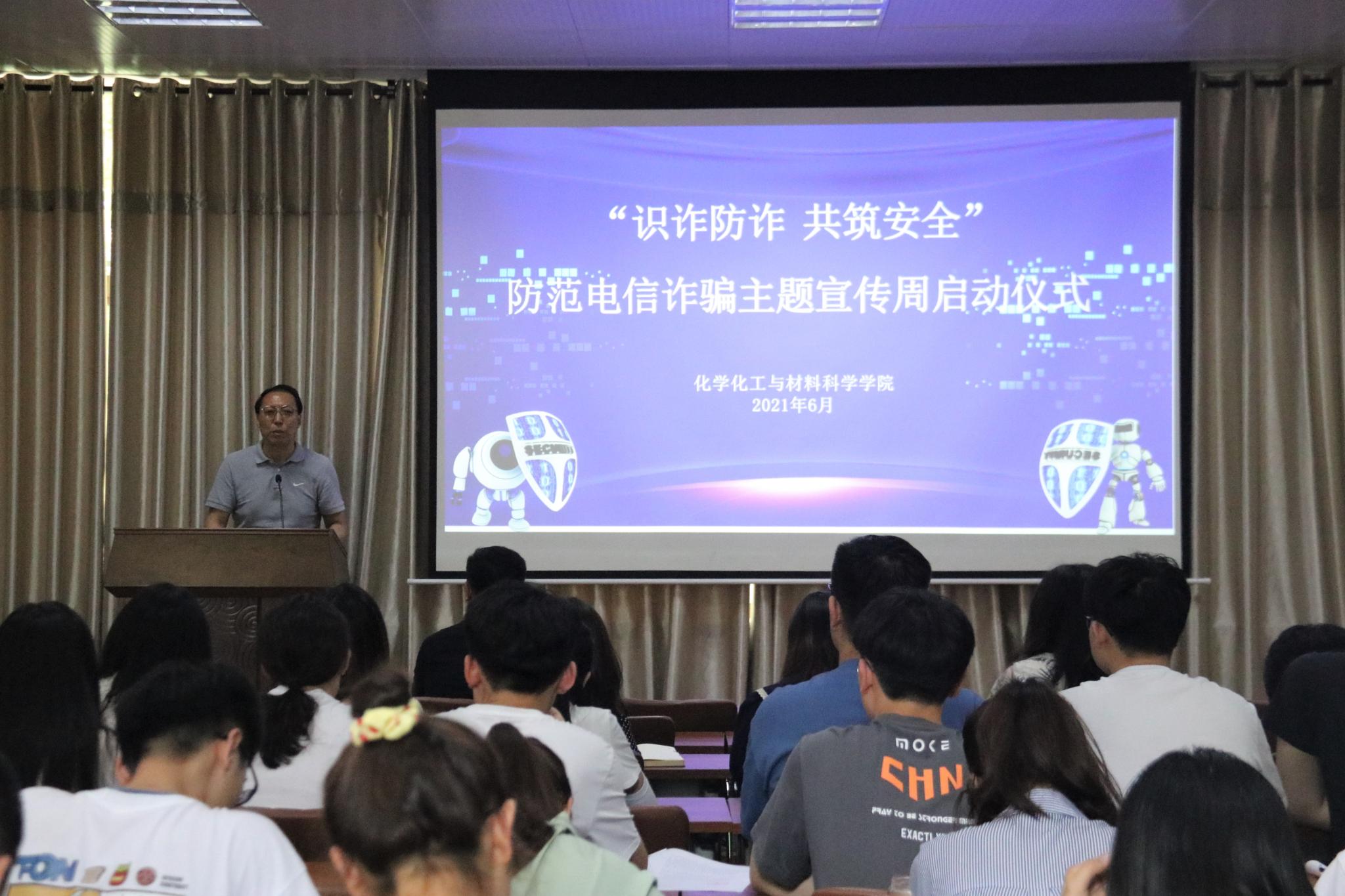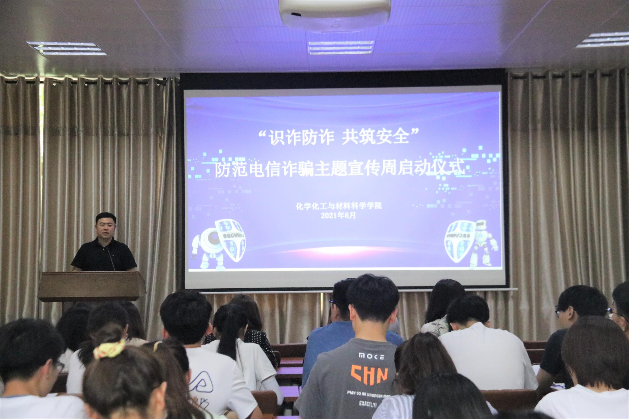 仪式伊始,现场下发宣传手册。孙南宣读防范电信诈骗主题宣传周活动通知并作出解读,他以真实发生的案例为诫,要求各班级高度重视本次活动,通过召开主题班会、排演情景剧、制作VLOG短视频、签订承诺书等形式让活动真正落到实处,不落一寝,不落一人,全力筑牢预防电信网络诈骗的第一道堡垒。孙南结合“国家反诈中心APP”和“防诈金钟罩”公众号的使用,强调识诈防诈的重要性,为自己的财产安全加上一道双保险。本科生学生代表张子豪作“凝聚班级力量,共筑反诈防火墙”报告,向大家介绍诈骗的相关形式。他提出,防骗工作应首先在班级这个基本单位开展,从“四个一”入手,多措并举,筑牢班级反诈“防火墙”。研究生学生代表孙忠森作“防范诈骗,刻不容缓”报告,通过讲述自己及身边亲友的真实案例,告诫同学们不贪横财,资料保密,提高警惕,及时沟通。