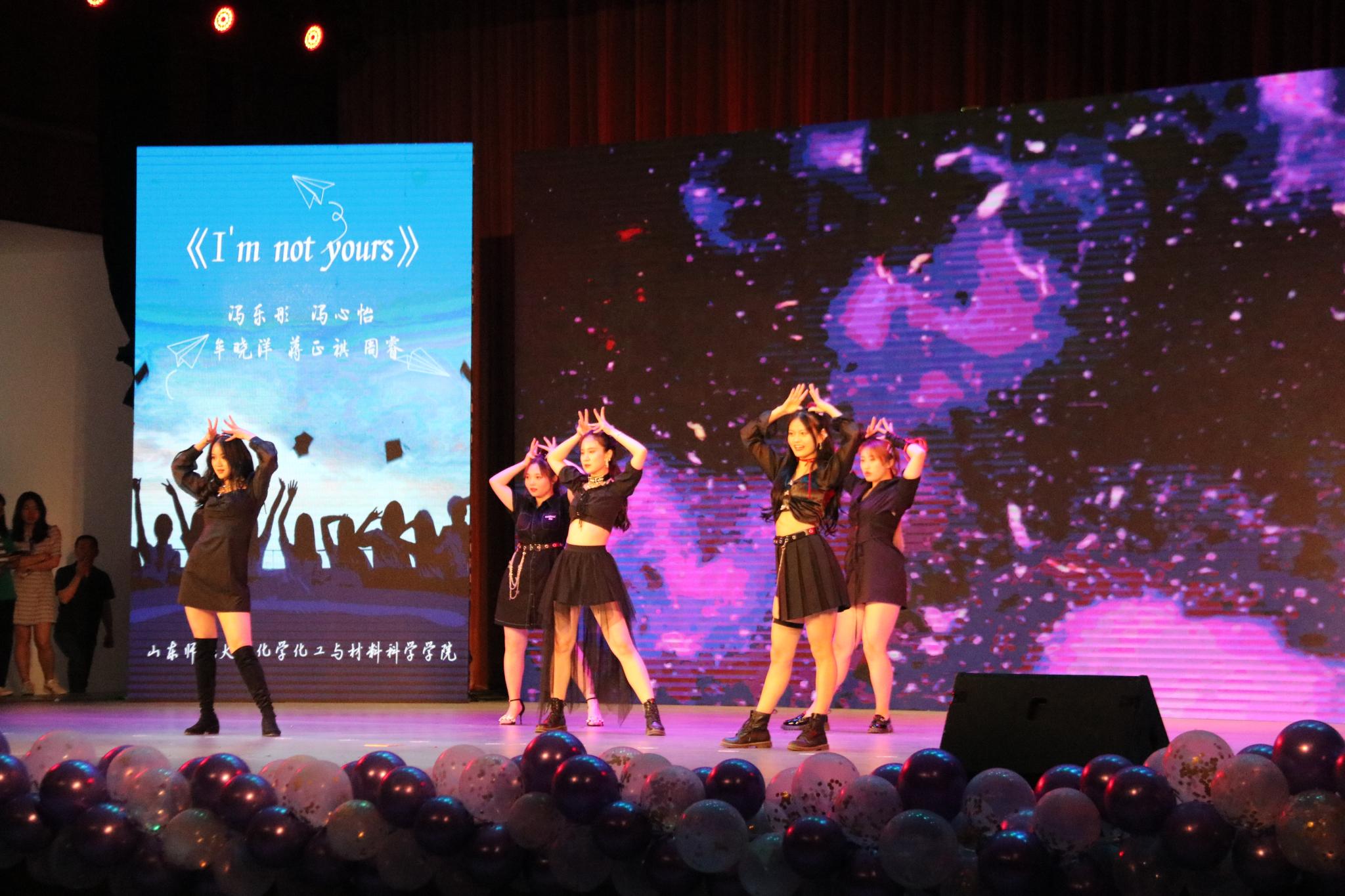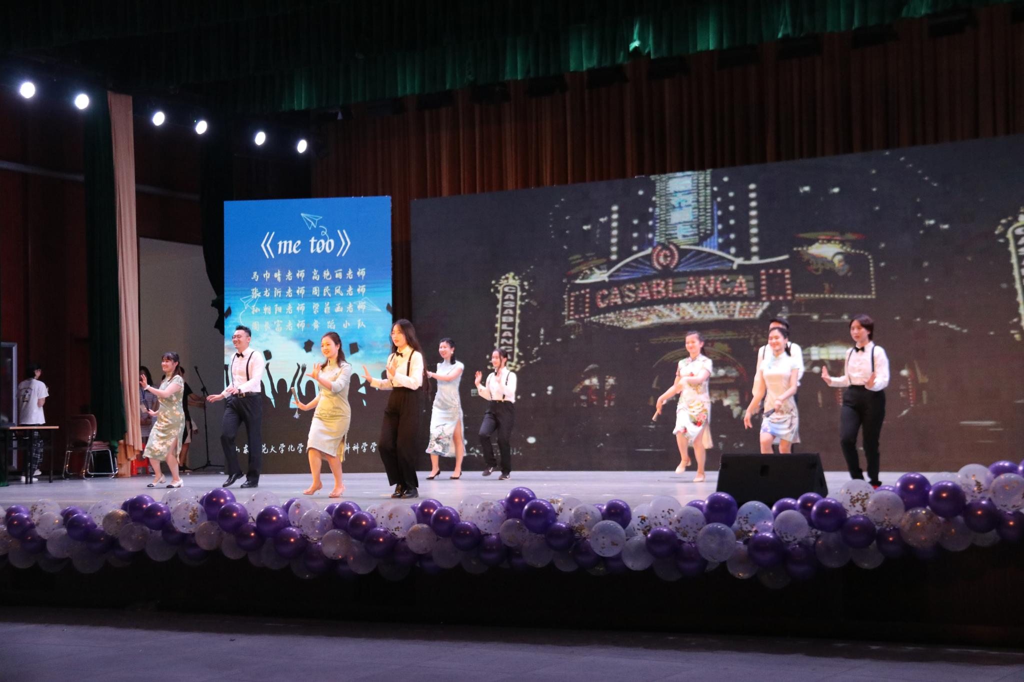毕业晚会在《I´m not yours》的开场舞中拉开序幕,劲爆激昂的舞蹈展现了化院毕业生的青春风采。本次晚会分为三个篇章,在第一篇章“卿卿骋少年,昨日殷桥见”中,由SDNU-MUSIC带来的原创说唱歌曲《在这里》和《我们的过去—跟我走》燃爆现场,表演者们和现场进行激情互动,号召毕业生们一起对过去进行告别,把最美好的记忆留在山师;新闻播报《师大新闻》以幽默诙谐的语调,为我们奉上毕业生们最后的校园生活轨迹。第二篇章“半夏花彼岸,似水经流年”中,全体辅导员表演的舞蹈《me too》为我们带来流行与经典的交织,让同学们看到了老师们别样的风采;走秀《师大黄金档》为我们再现热播剧的经典镜头。第三篇章“当时明月在,曾照彩云归”中,舞台剧《时光的足迹》采用朗诵与表演相结合的方式,为毕业生们作出大学四年的总结报告;最后,在《那些花儿》的合唱声中,2021届本科毕业生辅导员高艳丽走上舞台,深情回顾了从2017到2021的点点滴滴,以“一起,爱你”的谐音为毕业生们送上最真挚的祝福,在欢笑和泪水中,大家一同高喊“我们顶峰再见”的誓言,为本次毕业晚会画上圆满的句号。
