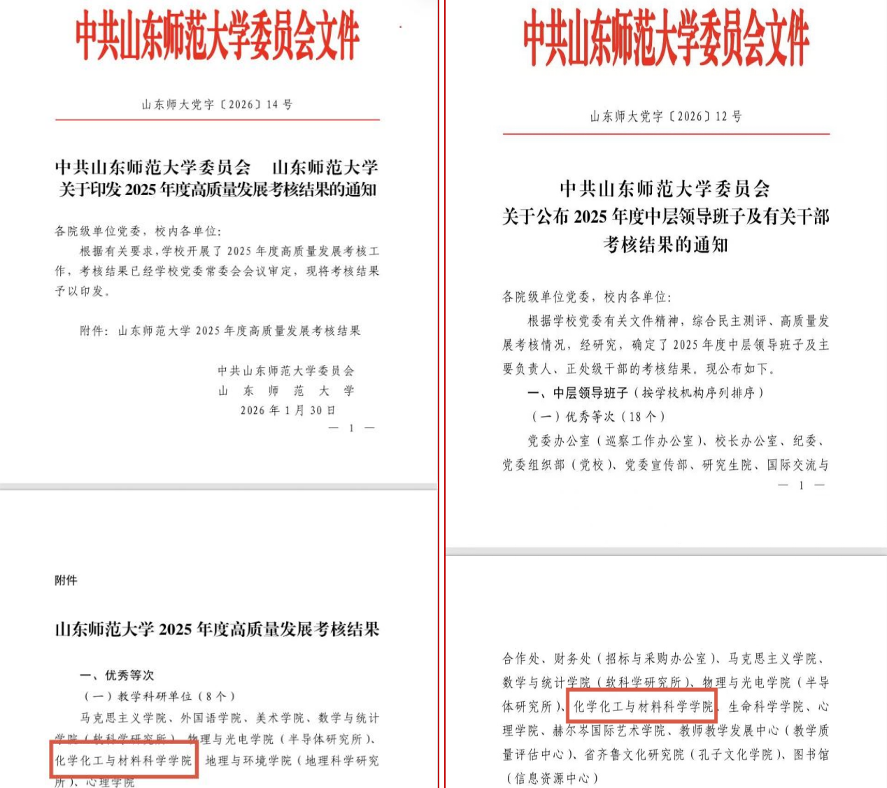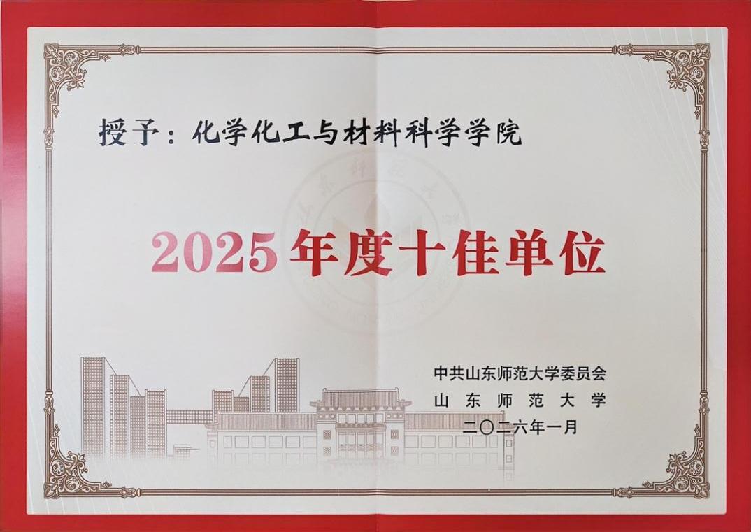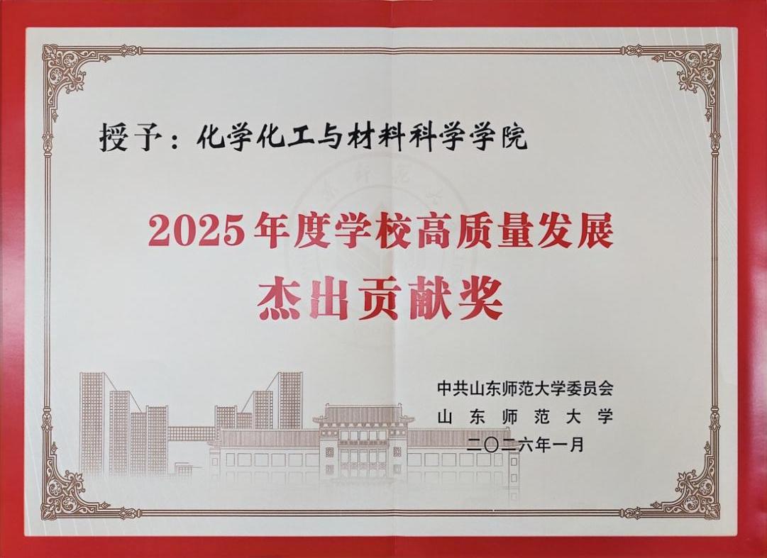 学院在学校2025年度高质量发展考核中荣获优秀等次,学院领导班子也在考核中荣获优秀等次。学院连续两年荣获学校十佳单位、连续三年荣获学校高质量发展杰出贡献奖,这是全院师生求实创新、团结奋进、顽强拼搏和共同努力取得的成绩。站在新起点,学院将秉持“争一流、补短板、显特色”的发展思路,强化学科建设,推动交叉融合,打造特色品牌,提升核心竞争力,以改革增动能、以实干促成效,为学校建设成为国际知名的一流师范大学贡献化院力量!