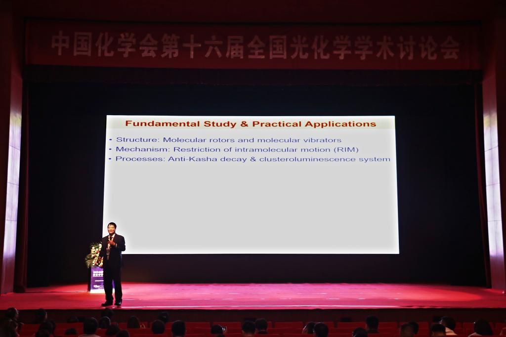唐本忠作了题为“New Photoprocesses of AlEgens”的大会报告,主要内容围绕AIE的结构、机理、过程以及应用展开;方维海作了题为“光化学反应机理的理论计算模拟”的报告,涉及了“非绝热效应和反应机理的关系”、“势能面的交叉:定性理解非绝热光反应机理”、“非绝热动力学”以及“应用”等方面内容;李振声作了题为“Nanoparticles of OLED and OPV molecules for Biomedical Applications”的报告,幽默风趣地介绍了有机发光分子材料以及太阳能细胞分子等在生物方面的应用。