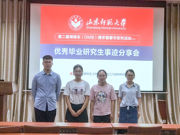 为给在校研究生留下宝贵的经验,发挥榜样学子的模范带头作用,6月4日晚19:00,第九期“优秀毕业研究生事迹分享会”于千佛山校区教学一楼1201报告厅举行,化学化工与材料科学学院常晋杰、张彩莉、付齐娟、王新燕4位2019届毕业研究生为大家讲述“优秀研究生故事”,化学院部分研究生聆听了本次分享。