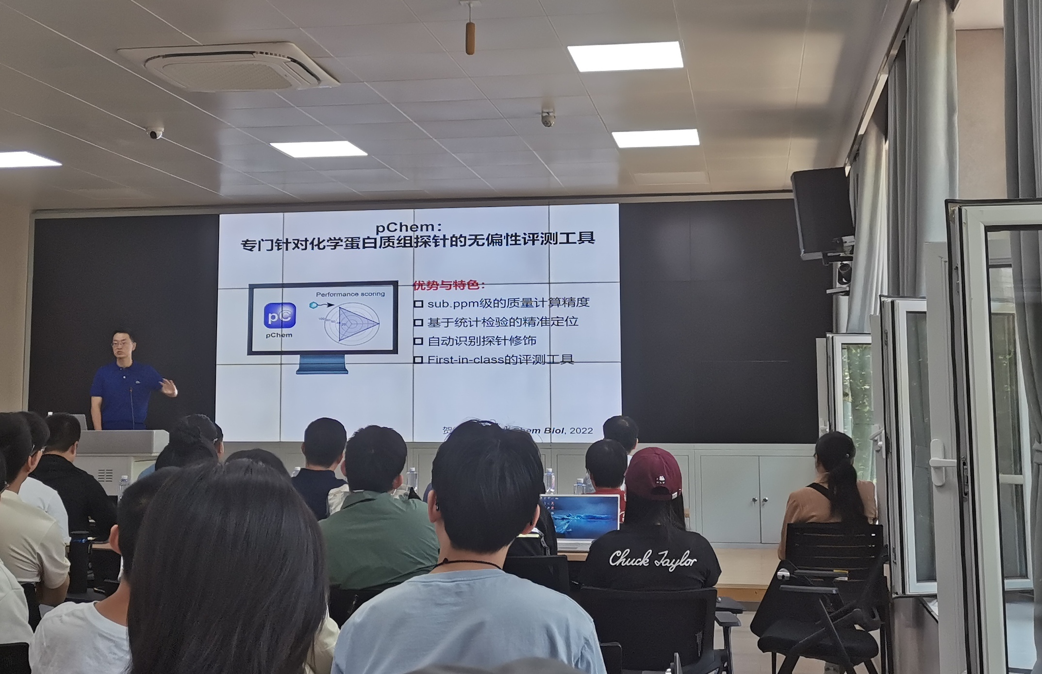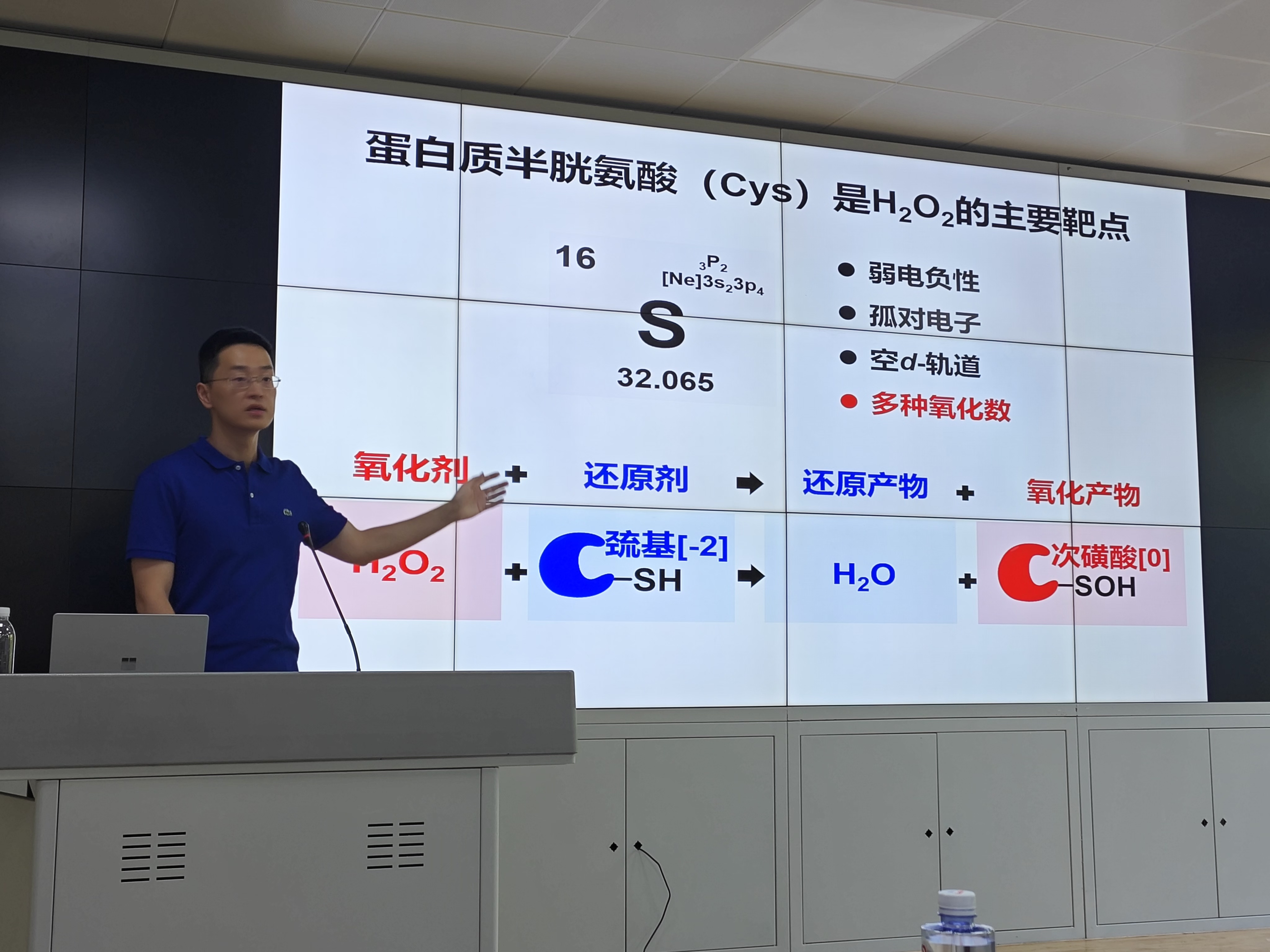 杨靖研究员首先介绍了半胱氨酸化学上的“可变性”与生物学功能上的“可调节性”,并指出过氧化氢修饰的次磺酸化的半胱氨酸能够可逆调节蛋白质的结构和功能。随后杨靖研究员分享了其团队在发展细胞次磺酸修饰组的定量化学蛋白质组分析方法的研究进展,其团队针对化学蛋白质组学开发的计算工具pChem,结合同位素编码探针以自动识别多种形式的修饰,可以精确给出计算质量和位点,大大提升化学蛋白质组探针开发的效率和水平。报告结束后,与会师生踊跃提问,杨靖研究员对在场师生提出的相关问题给予了耐心细致的解答,现场气氛热烈。本次学术报告的顺利举办,不仅让学院师生对通过半胱氨酸介导的氧化信号转导有了更加深入的了解,同时有效开拓了学院师生的学术视野,激发了学院师生的科研热情。