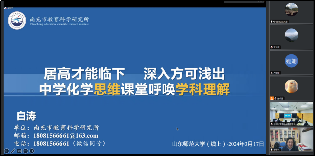 3月17日下午白涛老师以《居高才能临下,深入方可浅出——中学化学思维课堂呼唤学科理解》为题,立足当前化学教育的现状,提出发展学生思维是落实课程改革的重点,并结合典型化学试题案例,从学科理解和评价的视角让大家深刻体会化学思维课堂的样貌。