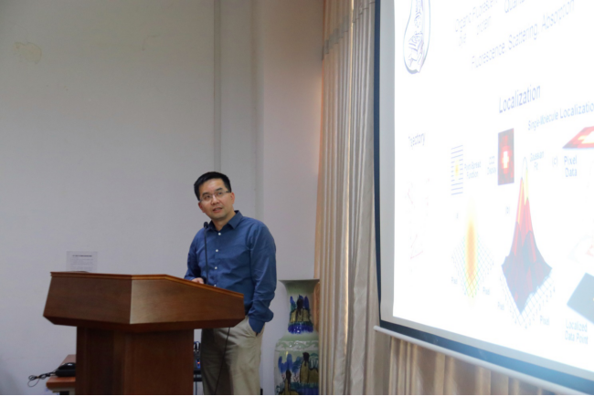 报告伊始,方宁教授介绍了其实验室的研究方向及发展的新型光学成像平台,此平台可提供亚衍射极限的空间分辨率、高角分辨率、单个分子水平的纳米定位精度和纳米粒子。接着,方宁教授讲述了基于差分干涉对比(DIC)显微镜的单粒子定向和旋转跟踪(SPORT)技术,以获取复杂细胞环境中各向异性等离激元金纳米棒的准确测量值。基于单分子的超定位和超分辨率显微镜成像技术能揭示更多详细的分子动力学和结构信息的能力。