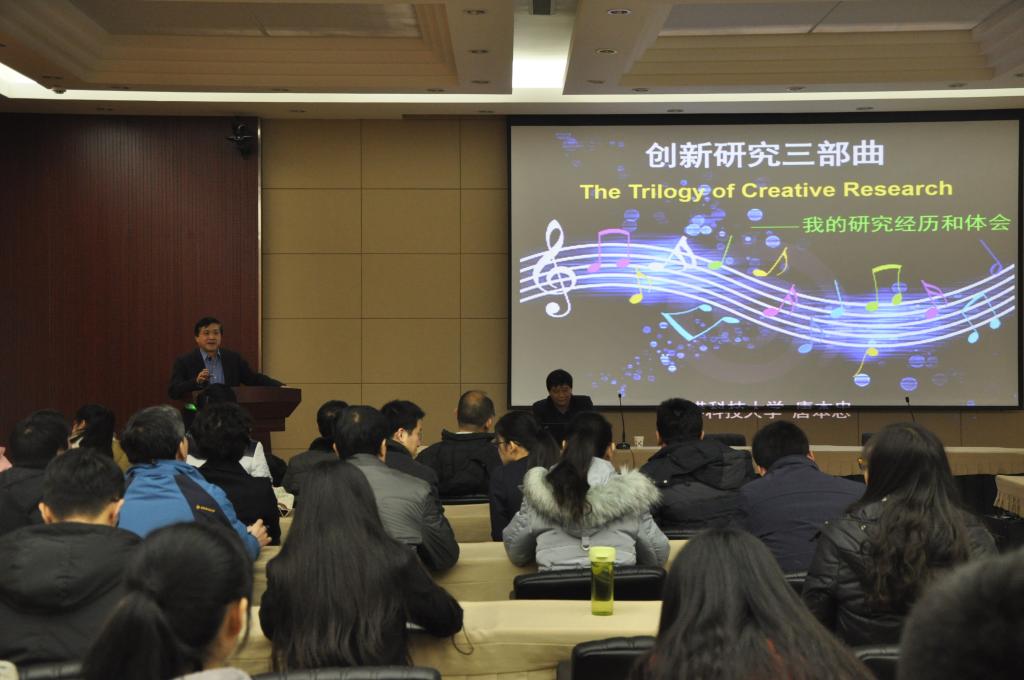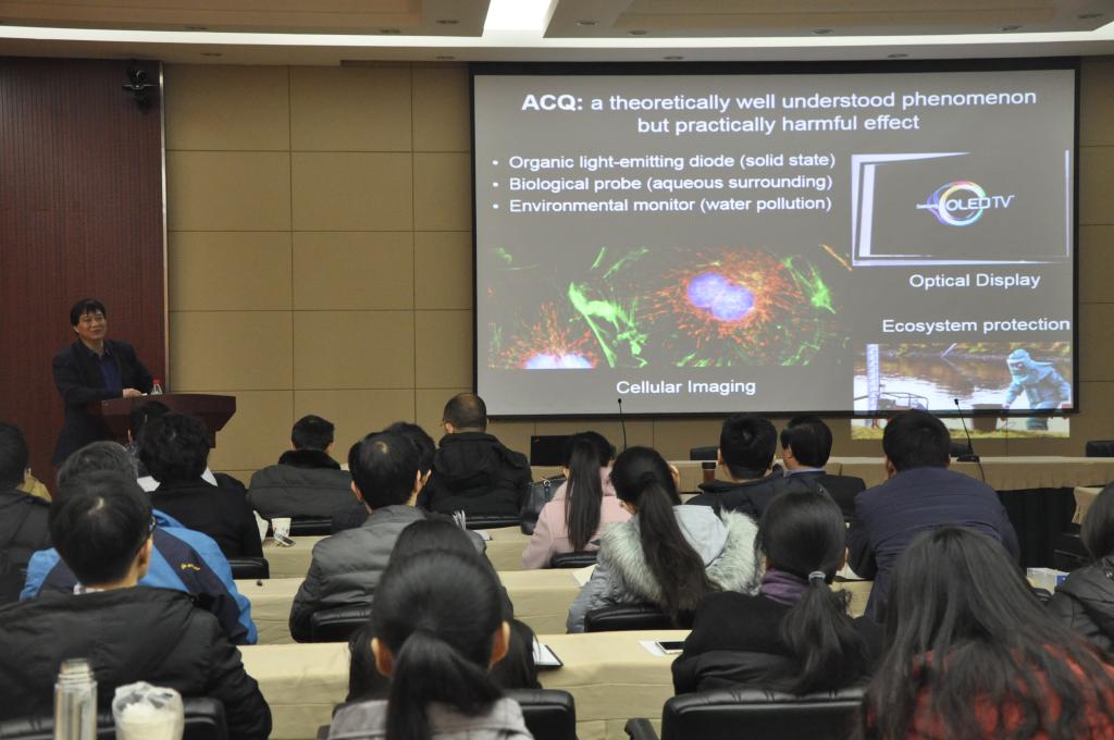 报告中,唐本忠院士首先提出三大问题,即“‘为什么做研究’‘做什么研究’‘怎样做研究’”,引发大家对科研工作的思考。接着,他结合自己在聚集诱导发光(Aggregation-InducedEmission,AIE)研究领域的研究经历,详细阐述了“创新研究三部曲”:发现新现象、发掘新问题,提出新概念、建立新模型,开发新应用、开拓新领域。。在报告中,唐院士不时与大家开展互动,用生动幽默的文学语言对复杂难懂的科学问题进行了清晰阐释,现场气氛活跃。在问答环节,他详细的回答了老师和同学们提出的问题。通过本次报告会,老师和同学们受益匪浅,开拓视野,激发了大家对科研工作更大的热情。