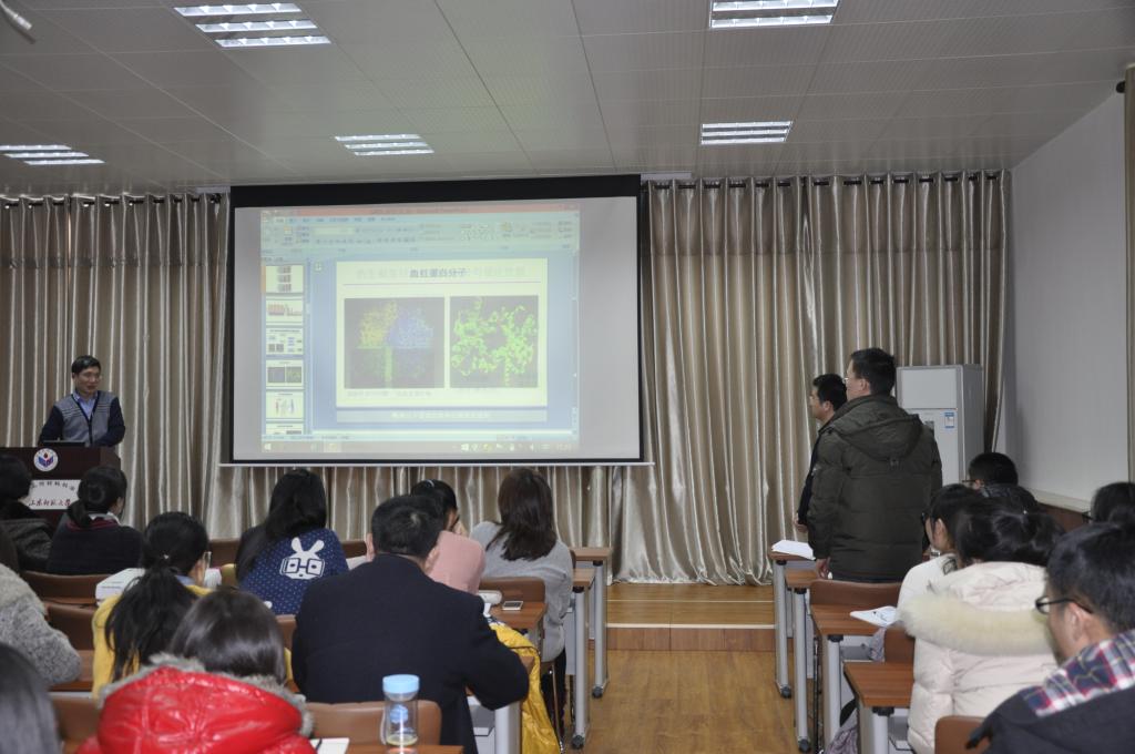 王金山书记首先欢迎吴教授来我校作学术报告,并简要的介绍了吴教授的科研工作经历和成果。报告中,吴教授主要介绍了自己多年来在金属有机框架结构材料(MOFs)作为荧光传感材料和仿生催化两方面开展的研究工作,并重点介绍了金属有机框架材料模拟生命体中各种酶在催化氧化、还原各类有机底物方面多年的研究成果与科研体会,报告内容丰富多彩。在互动环节,吴教授耐心回答了老师和同学们提出的问题。会后,老师和同学们纷纷表示获益匪浅,了解了“仿生框架材料的结构设计与催化性质”的研究价值和应用前景,开拓了研究思路。