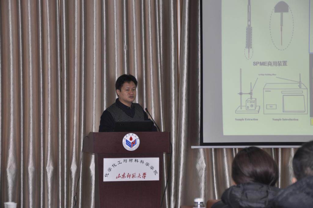 12月28日,应科技处、化学化工与材料科学学院邀请,中山大学教授、国家杰出青年科学基金获得者、英国皇家化学会会士欧阳钢锋教授来我校作了题为《固相微萃取探针研制与活体检测研究进展》的学术报告。报告会由山东师范大学校长唐波主持,化学院部分师生聆听了报告。