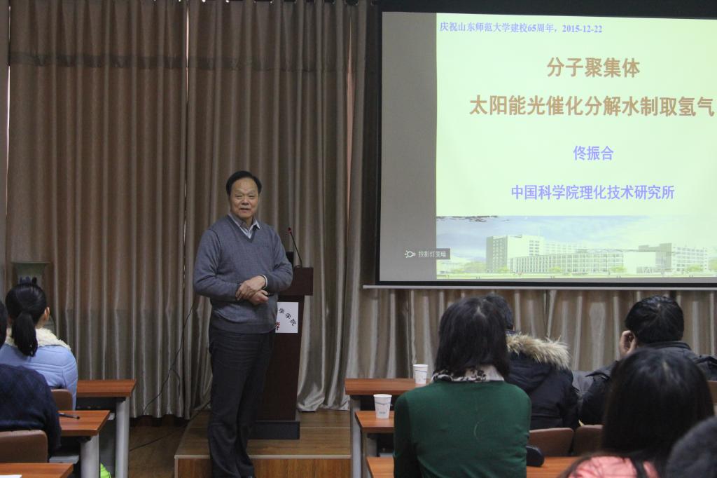 12月22日,应科技处、化学化工与材料科学学院邀请,中国科学院院士、著名有机化学家、中国科学院理化技术研究所研究员、理化技术研究所科技委员会主任、中国化学会光化学委员会主任、亚洲光化学会副主任佟振合院士来我校作了题为“太阳能光催化分解水制氢气”的学术报告。报告会前,校长唐波在文化楼二层接待室亲切会见了的佟振合院士,交流了学校的发展近况和学科建设情况,化学化工与材料科学学院负责同志出席了活动。随后,学术报告在千佛山校区教学一楼1201进行,校长唐波主持,化学院部分师生聆听了报告。