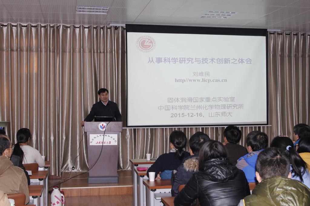 12月16日上午,中国科学院院士、我院80级校友刘维民教授在千佛山校区教学一楼1201教室作了《从事科学研究与技术创新之体会》的报告。报告会前,校长唐波在文化楼二层接待室亲切会见了刘维民院士,交流了学校的发展近况和学科建设情况,科技处、我院负责同志参加了活动。报告会由唐波主持,我院部分师生聆听了报告。