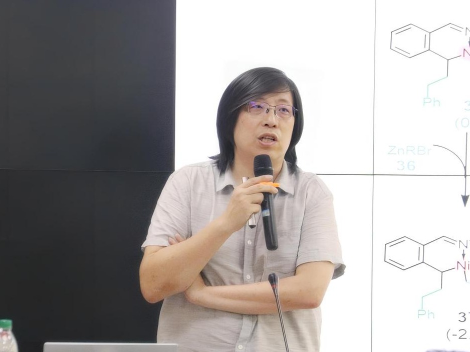 报告伊始,蓝宇简要介绍了合成化学和理论化学之间的区别与联系,他指出路线比结果更重要,通过理论计算框架能够对实验进行指导和预测。接下来,蓝宇从合成机理的角度介绍了反应活性和选择性的匹配,具体包括金属介导的电子调节模型、电子转移活化模型以及理论计算中的相互作用模型。基于此,其团队对金属介导的电子调节模型中的电子转移过程进行了深入研究。利用亲电锌试剂与镍发生Z-类型配位进行电性调控,从而活化有机化合物中惰性的sp3杂化C进行还原消除生成碳碳双键,实现了单电子转移的双金属协同催化。然后,蓝宇分享了其团队在亚胺、醛、酮等化合物的还原氢化过程所取得的成果,将理论计算预测模型与实验验证相结合,通过调节催化剂中的金属、溶剂、反应条件等改进反应物活化过程、提升反应选择性。报告结束后,与会师生踊跃提问,蓝宇对在场师生提出的相关问题给予了耐心细致的解答,现场气氛热烈。本次学术报告的顺利举办,不仅让学院师生亲电试剂转化机制以及理论计算有机化学的认识更加深入,同时有效开拓了学院师生的学术视野,激发了学院师生的科研热情。