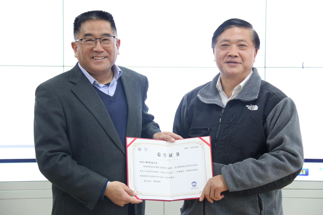报告会结束,与会师生踊跃提问,郝京诚对在场师生提出的相关问题给予了耐心细致的解答,现场气氛热烈。最后,唐波教授为郝京诚教授颁发荣誉证书。本次学术报告的顺利举办,不仅让学院师生对表面活性剂有了更加深入的了解,同时有效开拓了学院师生的学术视野,激发了学院师生的科研热情。