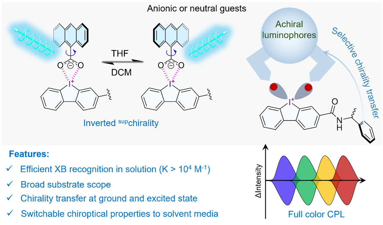 在溶液相中通过卤键构筑手性功能材料仍面临挑战,这主要源于溶剂化效应对传统卤键相互作用具有显著的干扰作用。该工作报道了一种溶液中卤键介导的手性诱导策略,从而实现了具有可调性质且底物适用范围广的离散态手性光学材料的构筑。I(III) 对中性和阴离子型卤键受体均表现出较强的结合能力,其缔合常数约为 104 M-1。该稳健的相互作用使得在基态和激发态中均能够实现高效的手性诱导。所得卤键复合物表现出溶剂响应行为,在二氯甲烷和四氢呋喃中呈现镜像的手性光学性质。此外,该体系对多种卤键受体均具有良好的适应性,能够在不同体系中实现有效的手性诱导,进而实现全色圆偏振光的发射。