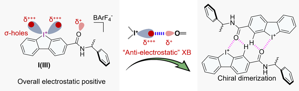 传统卤键通常被视为以静电为主导的相互作用,其形成依赖于卤原子σ-hole与富电子位点之间的电势匹配,这一认识在大多数体系中是成立的。然而,近年来报道了的一类发生于同电性离子组分之间的卤键,突破了静电驱动为主导的经典认知。该研究通过在一个环状高价碘(III)骨架(记为 I(III))中引入了中心手性位点,该分子在固态及低极性溶剂中能够通过阳离子型抗静电卤键自组装形成二聚体,其结构由四重卤键和氢键网络协同稳定。目前该抗静电卤键的研究大多集中于阴离子组分间,而该工作首次为阳离子型“抗静电”卤键提供了实验性的证据。