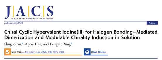 Shuguo An*, Aiyou Hao, Pengyao Xing*, Chiral Cyclic Hypervalent Iodine(III) for Halogen Bonding-Mediated Dimerization and Modulable Chirality Induction in Solution, J. Am. Chem. Soc., 148 (2026) 7876-7886.
