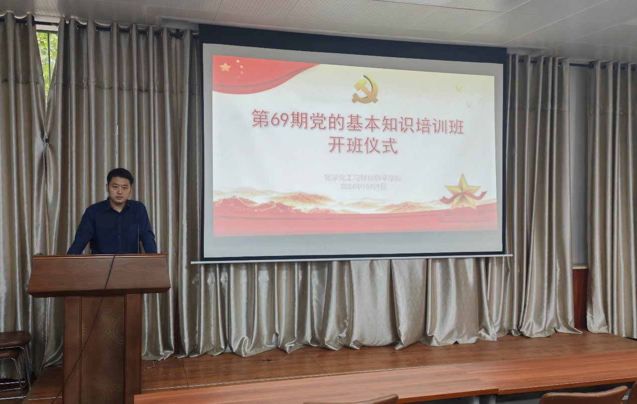 为深入学习贯彻习近平新时代中国特色社会主义思想和党的二十届三中全会精神,切实加强入党积极分子的培养教育工作,10月9日中午,化学化工与材料科学学院于千佛山校区教学一楼1201报告厅举办第69期党基班开班仪式暨开班第一课。仪式由党基班班主任、2021级辅导员赵晨主持,2022级辅导员周长富担任开班第一课主讲人,第69期党基班全体学员参加。