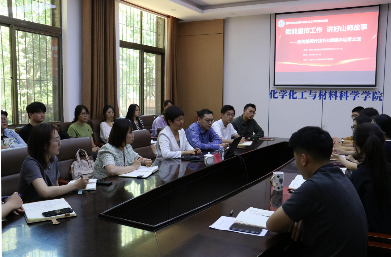 5月15日,化学化工与材料科学学院韶华团校“慧德讲堂”举办宣传工作专题培训,邀请学校党委宣传部意识形态工作科科长刘阳作《赋能宣传工作·讲好山师故事——新闻稿写作技巧&新媒体运营之道》辅导报告。学院全体辅导员、团校宣传队伍骨干参加培训。活动由学院党委副书记魏宁主持。