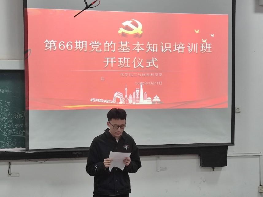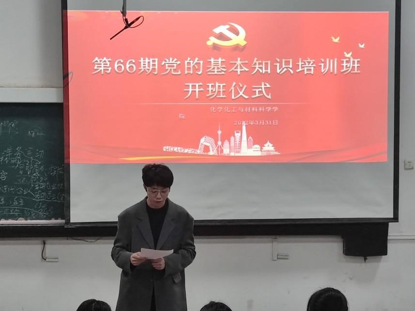 为深入学习贯彻党的二十大精神,切实加强入党积极分子的培养教育工作,3月31日,化学化工与材料科学学院举办第六十六期党基班开班仪式,2021级辅导员赵晨担任主讲人,第六十六期党基班全体学员参与会议。