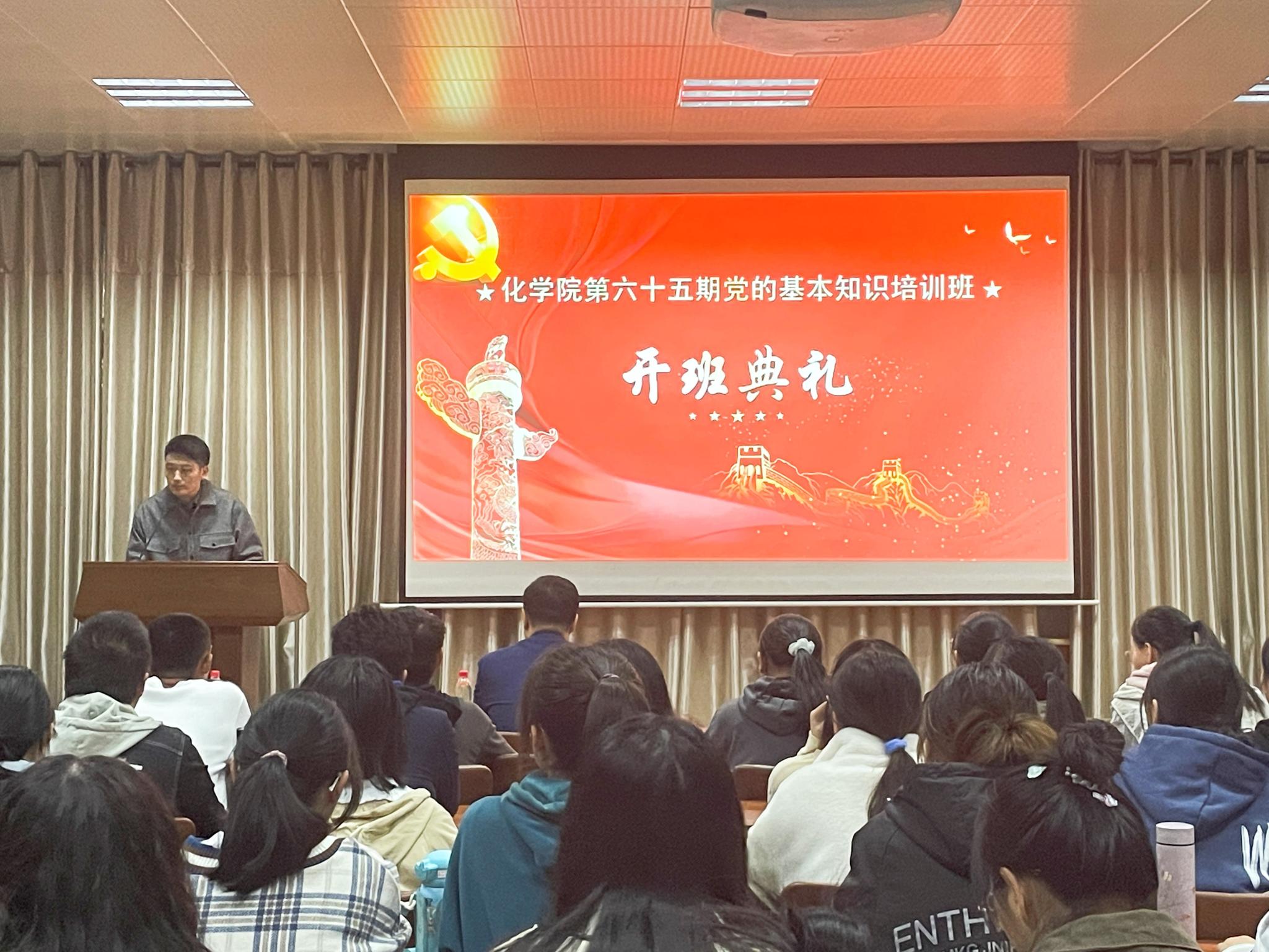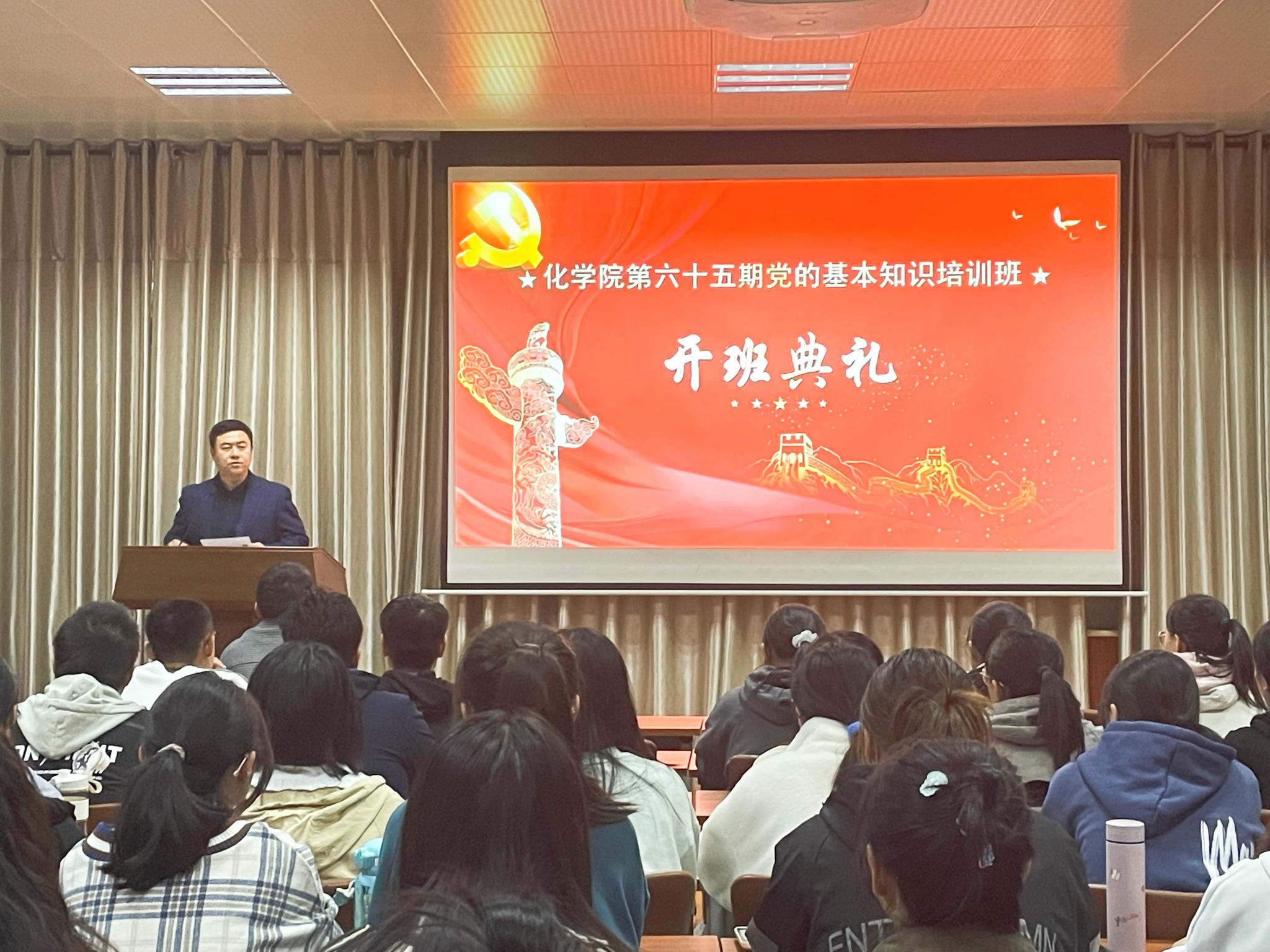 10月10日晚,为深入学习贯彻习近平新时代中国特色社会主义思想,全面贯彻落实党的十九大和十九届历次全会精神,切实加强入党积极分子的培养教育工作,化学化工与材料科学学院于千佛山校区一号教学楼1201报告厅举办第65期党基班开班仪式暨开班第一课,学院党委副书记孙南出席并讲话。典礼由党基班班主任、2020级辅导员周长富主持,第65期党基班全体学员参加。