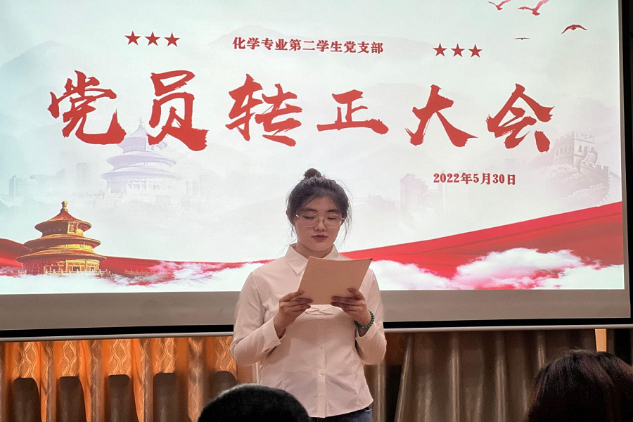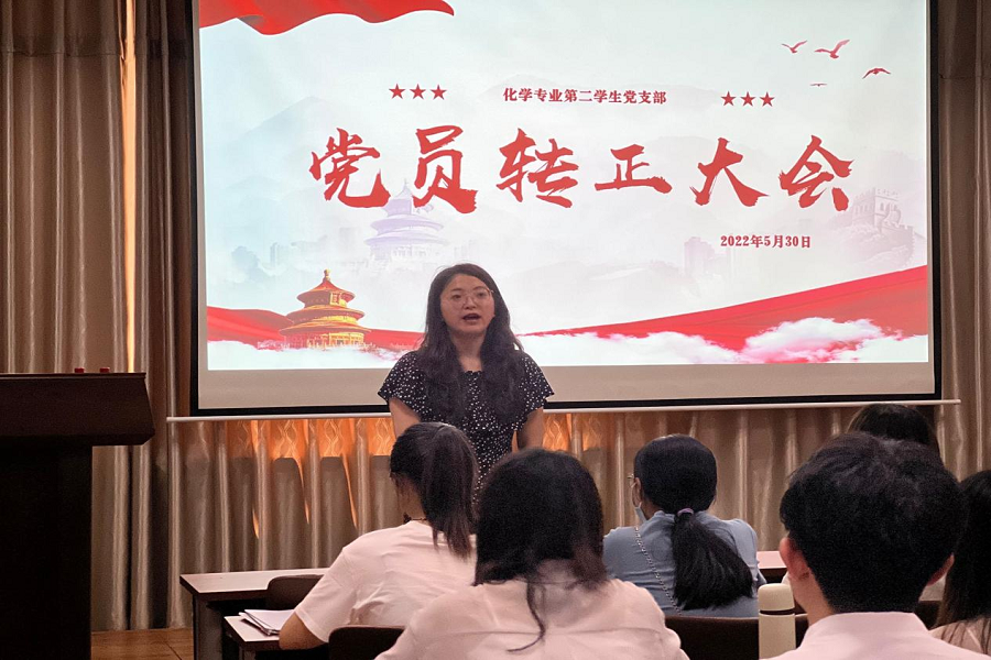 建团百年,青春向党,5月30日上午,化学化工与材料科学学院化学专业第二学生党支部于千佛山校区一号教学楼1201教室成功举办党员转正大会,讨论对李雨含等8名预备党员的转正工作。本次大会由化学专业第二学生党支部组织委员贾文雨主持,支部22名学生党员参会。