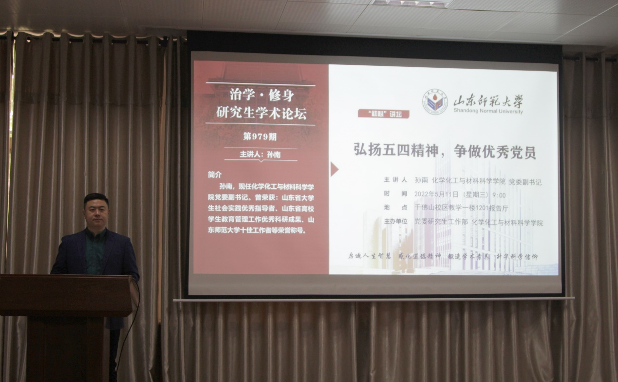 为庆祝中国共产主义青年团成立百年,督促广大党员、团员弘扬五四精神,牢记初心使命,5月11日上午,化学化工与材料科学学院于千佛山校区教学一楼1201报告厅举办“弘扬五四精神,争做优秀党员”主题讲座,本次讲座由学院党委副书记孙南担任主讲人,学院研究生第二党支部全体党员积极参与其中。