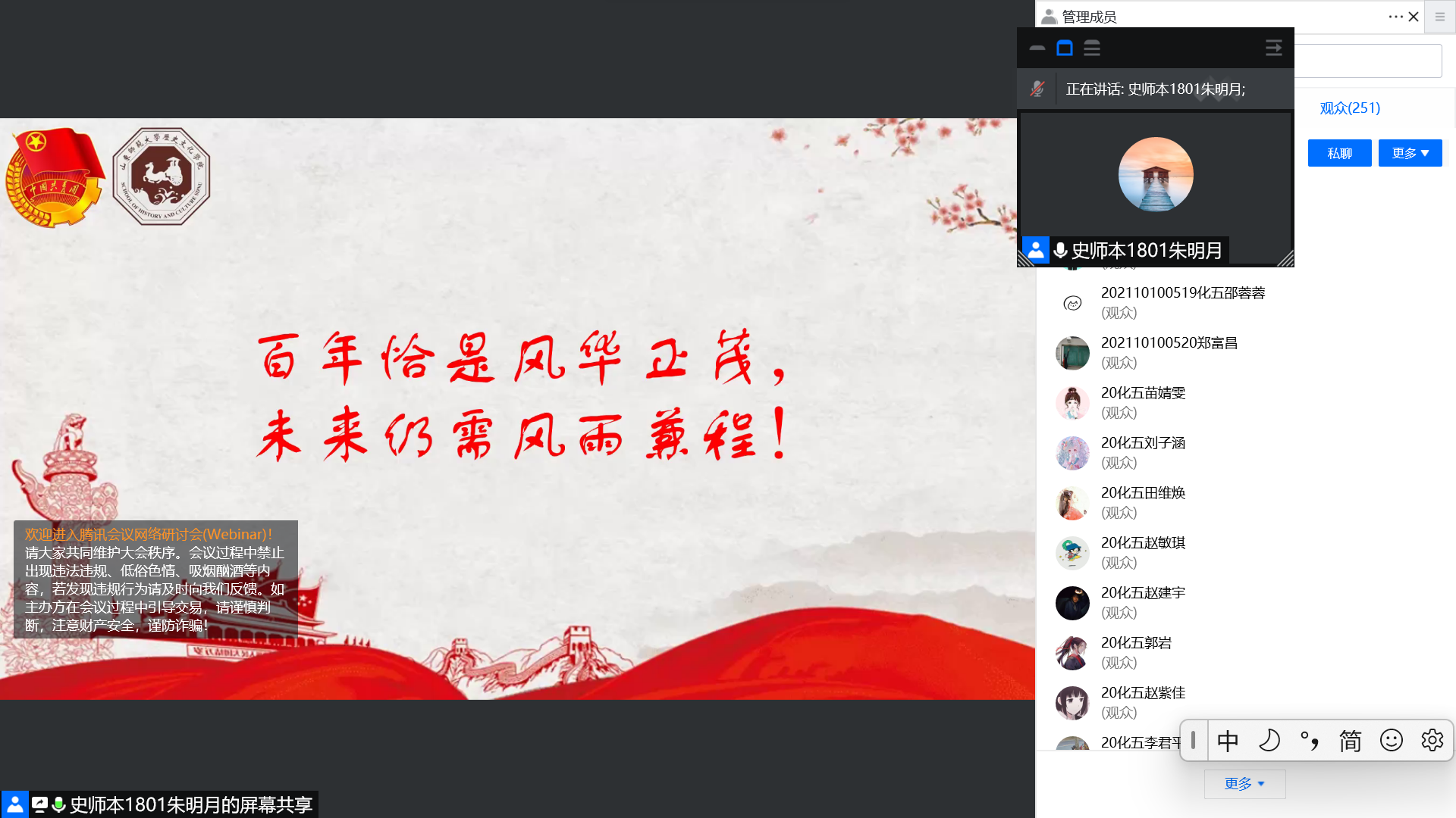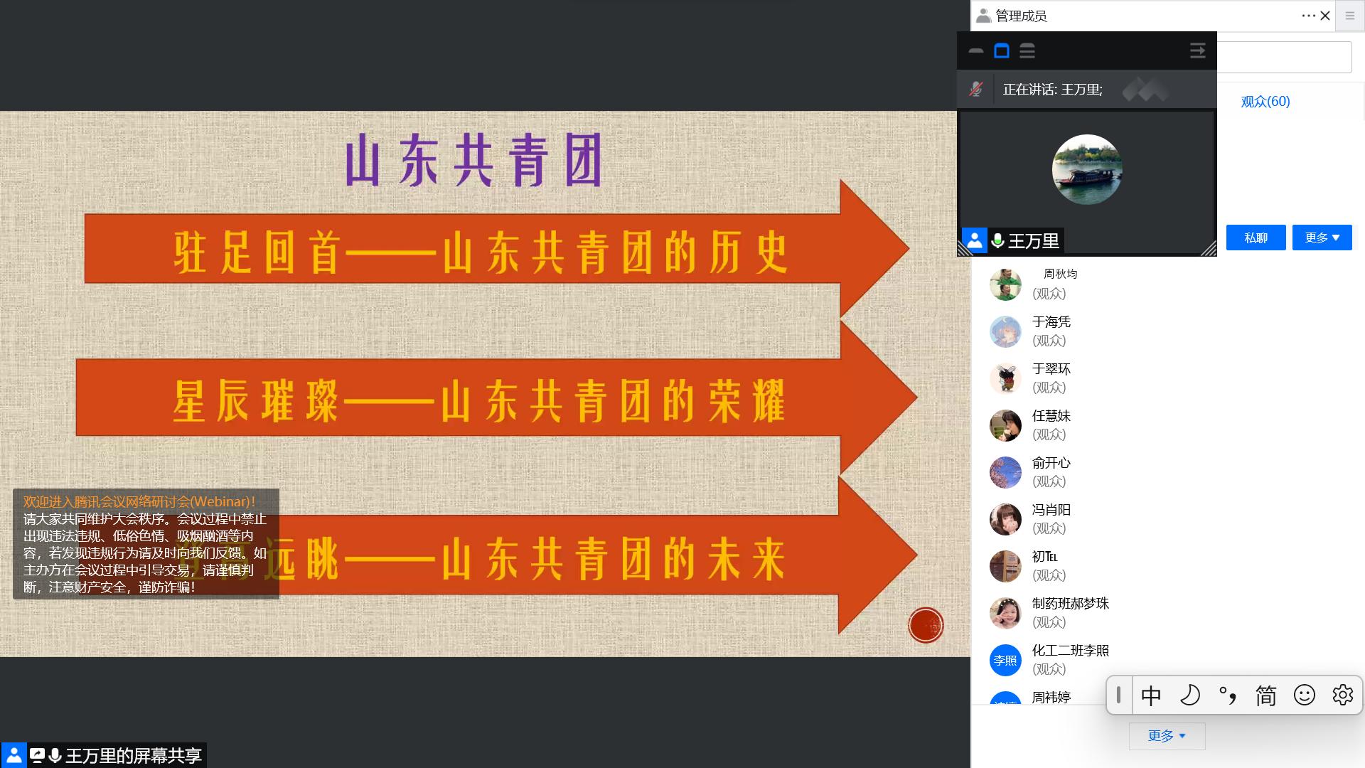 28日晚,会议伊始,朱明月首先介绍了共青团的基本概况,随后从革命年代的山东共青团到建国后的山东共青团,详细阐述了山东共青团百年来的发展历程。最后,朱明月强调了青年的力量,并以“百年恰是风华正茂,未来仍需风雨兼程”为寄语,向同学们表达了携手奋进、共创未来的期盼。29日晚,宣讲团成员王万里首先带领同学们回顾了山东共青团的历史和取得的成就,接着从远眺共青团的未来出发,强调中国青年的奋斗目标和前行方向归结到一点,就是坚定不移听党话、跟党走,努力成长为堪当民族复兴重任的时代新人。宣讲结束后,各支部学生于线上积极交流自己的感悟,分享自己的见解,营造了良好的团史学习氛围。