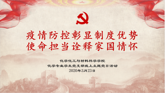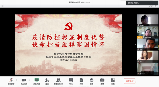 3月23日,化学专业学生党支部开展“同心战‘疫’,同‘屏’共振”线上主题党日活动。本次活动依托网络平台,由党支部书记周民凤主持进行。