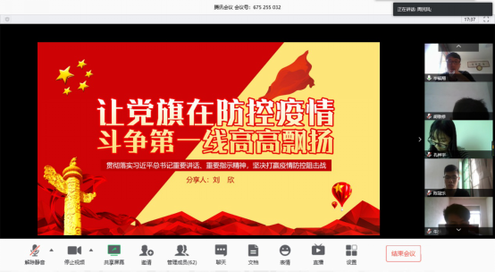刘欣则以“发挥党员模范作用,让党旗在防控疫情斗争第一线高高飘扬”为题,抒发当代青年党员在疫情背景下的所念所想。以钟南山院士、廖良开书记、冯丽萍护士长为例,分享先进党员的榜样事迹,充分展现疫情特殊背景下党员先锋模范的带头作用、骨干作用与桥梁作用,号召广大青年党员继续发挥先锋模范作用,为坚决打赢疫情防控阻击战而努力奋斗。