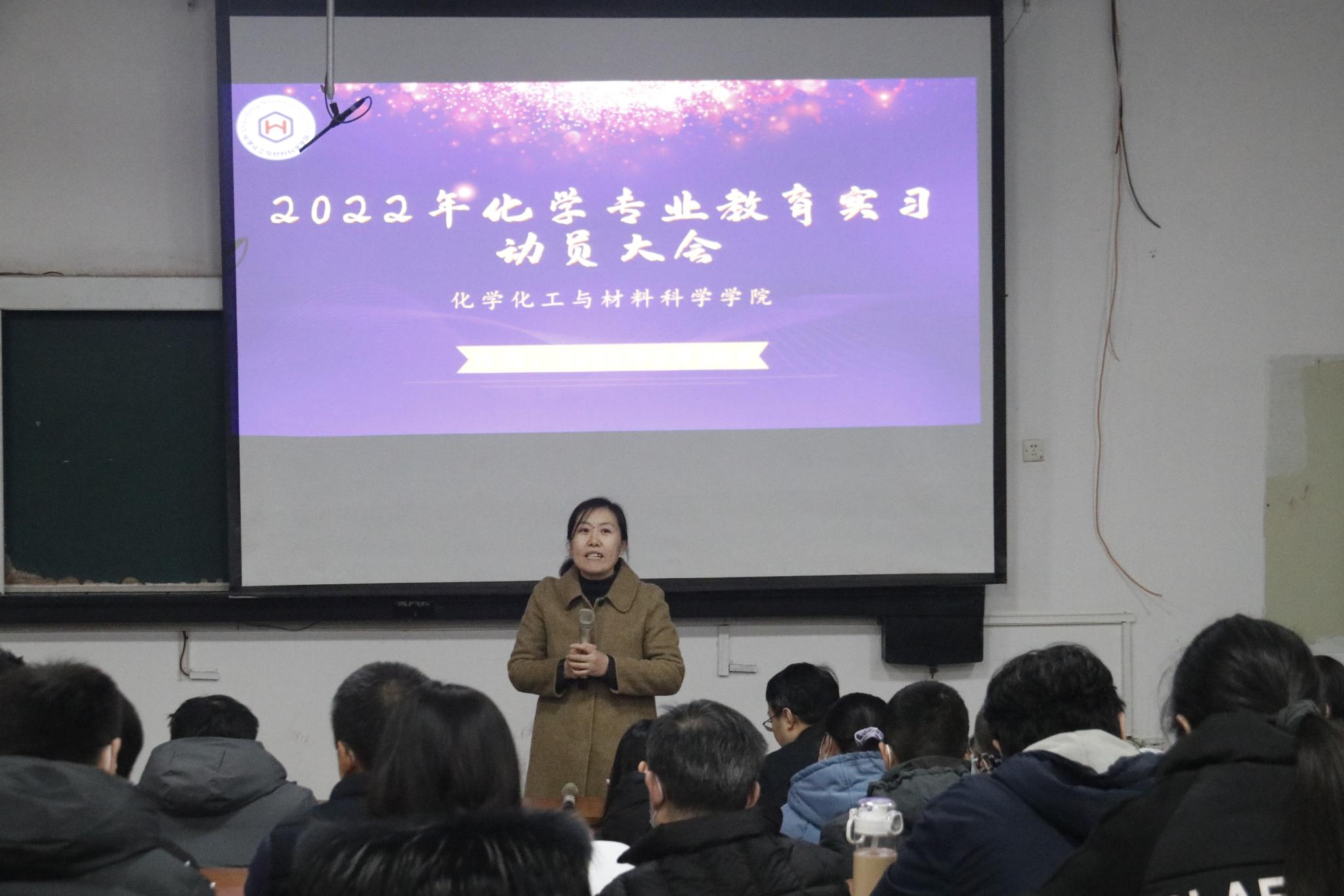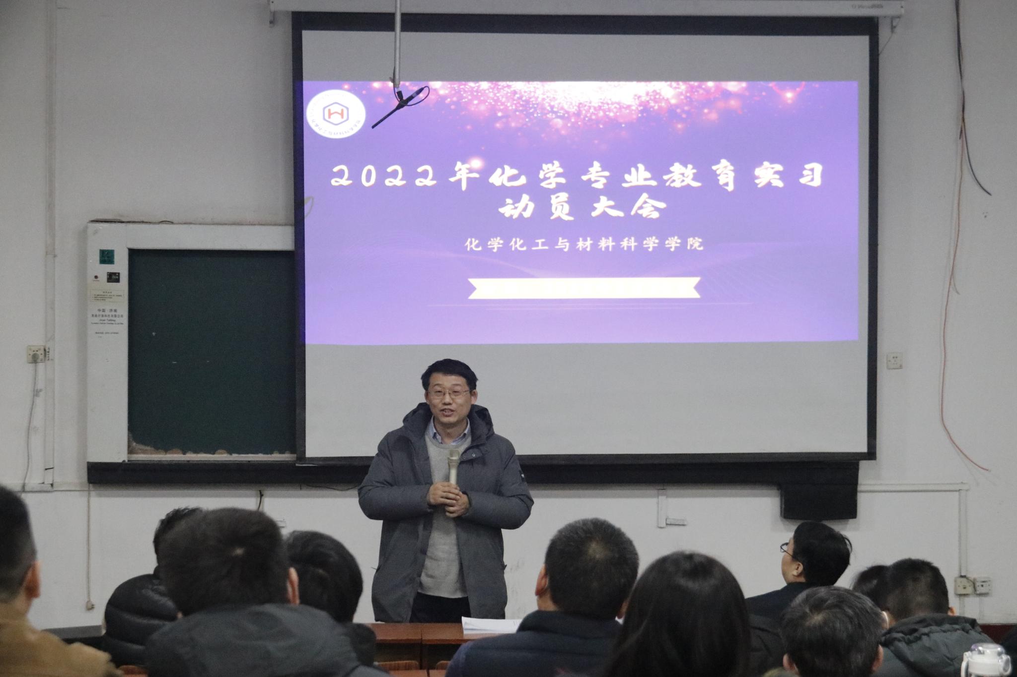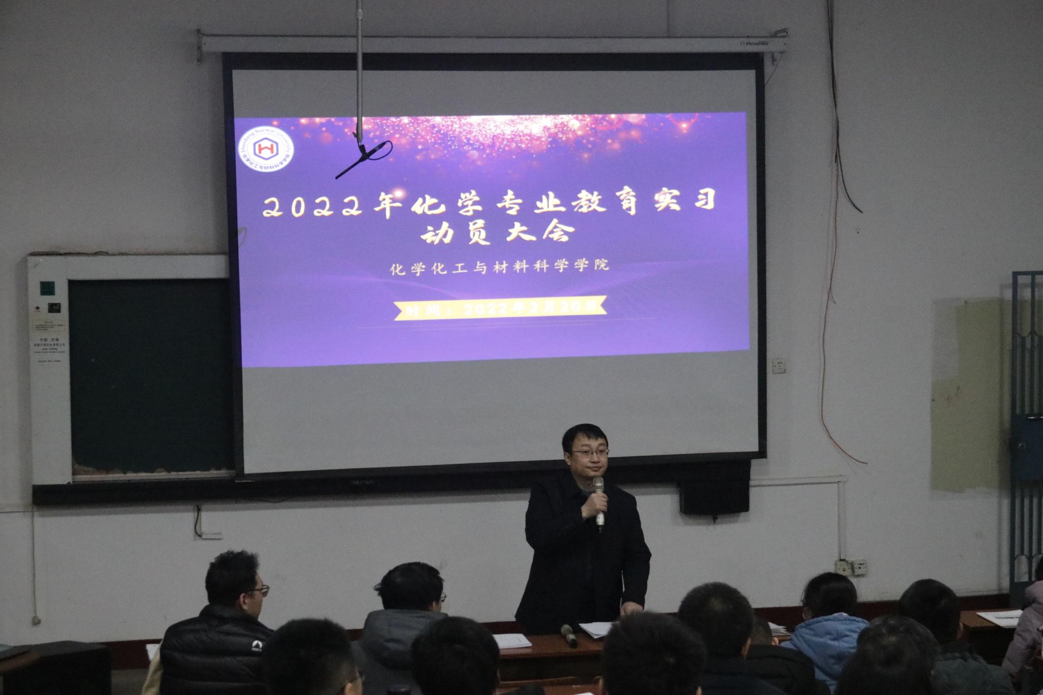 为响应国家疫情安全防控工作的号召,部署学院新学期相关事宜,同时为合理开展实习工作任务,保证实习工作顺利进行,2月20日下午,化学化工与材料科学学院采取线上线下相结合的方式,于千佛山校区一号教学楼1215教室举办2022年化学专业教育实习动员大会,学院副院长耿琰、化学系主任孙传智、化学教学论教研室主任亓英丽、2019级辅导员孙朝阳以及实习指导老师和2019级学生参加会议。