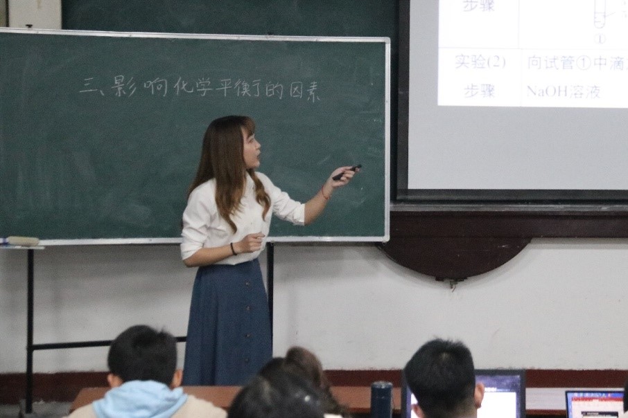 本次比赛选手将传统的教学模式与新颖的教学理念相融合,通过模拟授课,模拟讨论,模拟提问等方式展开授课。2018级化学二班的贾文雨同学,以“影响化学平衡的因素”为授课主题,其充分的准备,得体的谈吐,清晰的思路,赢得了在场观众的一致好评,展现了当代师范生的专业素养。选手比赛结束后,姜言霞对各位选手在内容把握、情景设计以及课程完整度等方面做出了肯定。同时,她也对其中存在的问题进行点评,她指出教学内容要努力渗透核心素养与理念,在学生活动设计方面,教师要和学生有深层次的交流,要真正让学生有思维层面的反响。