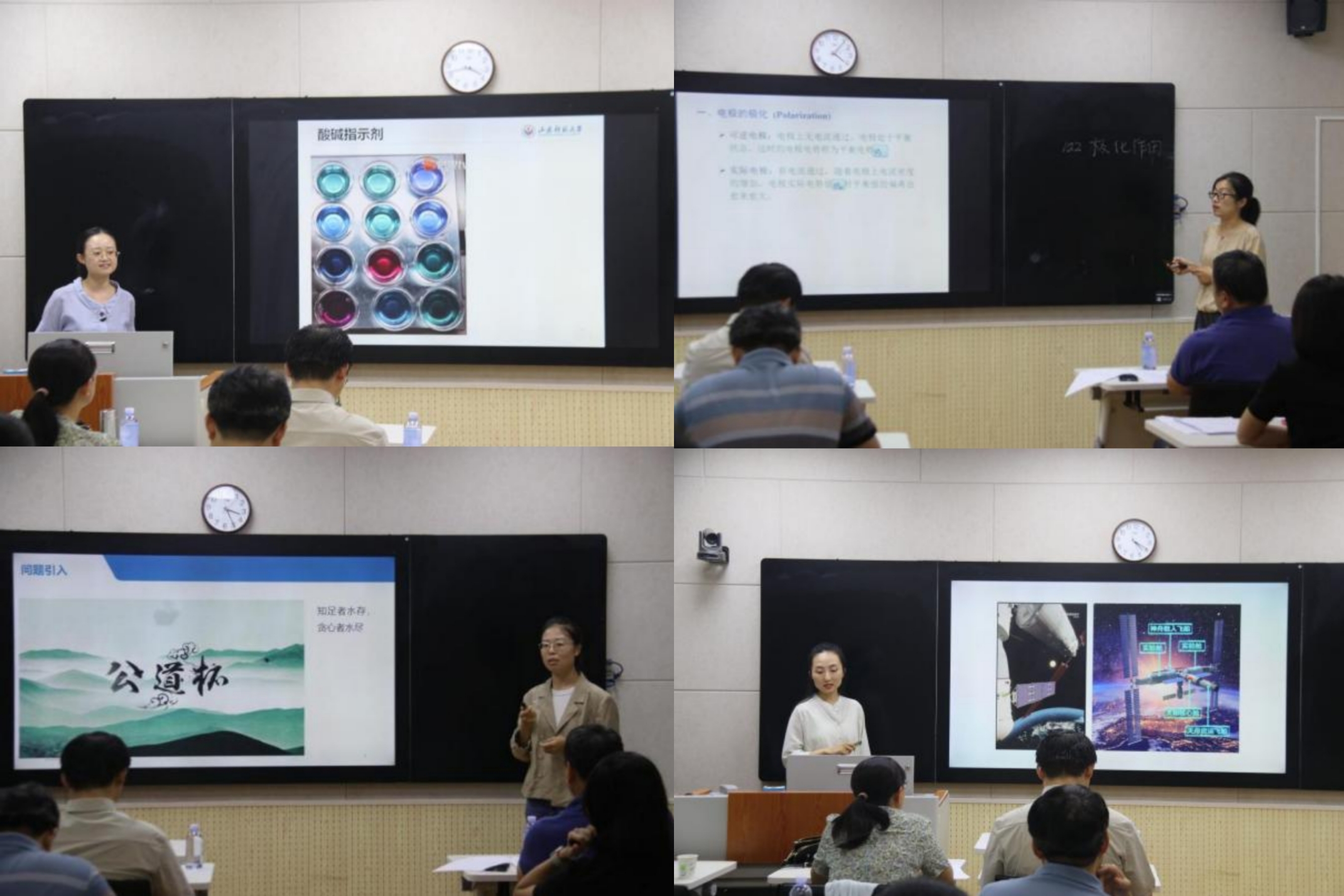 各位评委老师们从青年教师们的教学内容、教学组织、教学语言与教态、教学特色四个方面进行了评审。首先对各位教师比赛前的精心准备予以肯定,同时对课程的板书设计、课程思政元素、AI技术与课程的融合等方面提出了中肯的意见。