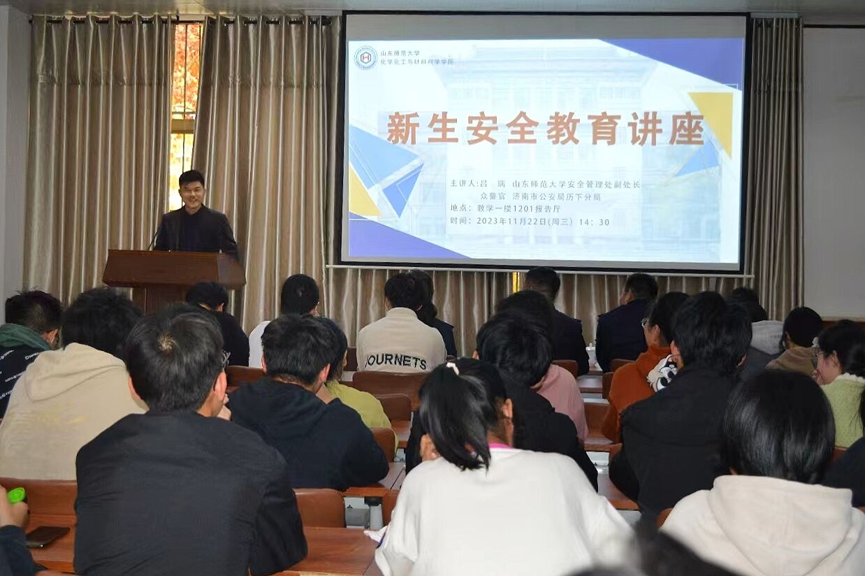 11月22日下午,化学化工与材料科学学院于千佛山校区教学一楼1201报告厅举办新生安全教育讲座。本次讲座邀请学校安全管理处副处长吕瑞、济南市公安局历下分局警官作为主讲嘉宾。讲座由学院党委副书记魏宁主持。