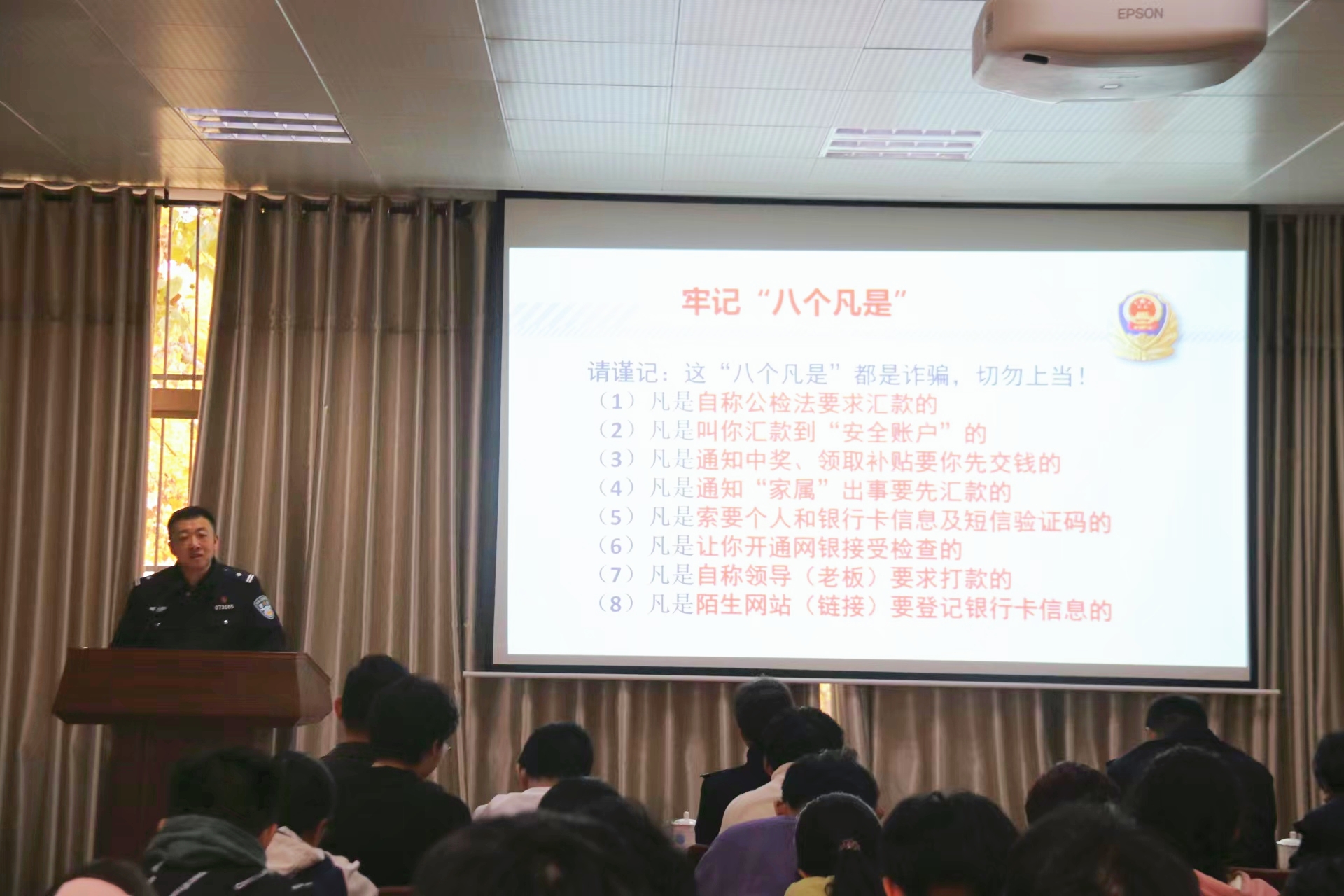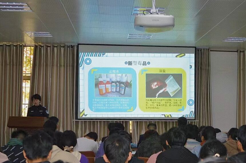 讲座中,部竞美警官首先进行禁毒知识讲解。她展示了当前毒品的常见种类,从外观、吸食方法、戒断反应等多种方面详细介绍了大麻、冰毒、鸦片等毒品的有害影响。她强调,当代大学生要洁身自好,远离不良场所,提高警惕意识,真正做到珍爱生命、远离毒品。随后,苗成建警官进行防范电信网络诈骗宣讲,他从电信诈骗的定义、现状、特点、形式、种类和预防措施等多方面详细讲解了防范电信网络诈骗有关知识。他指出,当前电信网络诈骗的手段高、形式多,大学生要有反诈防骗意识,不断提高反诈防骗技能,切实保护好个人财产安全。
