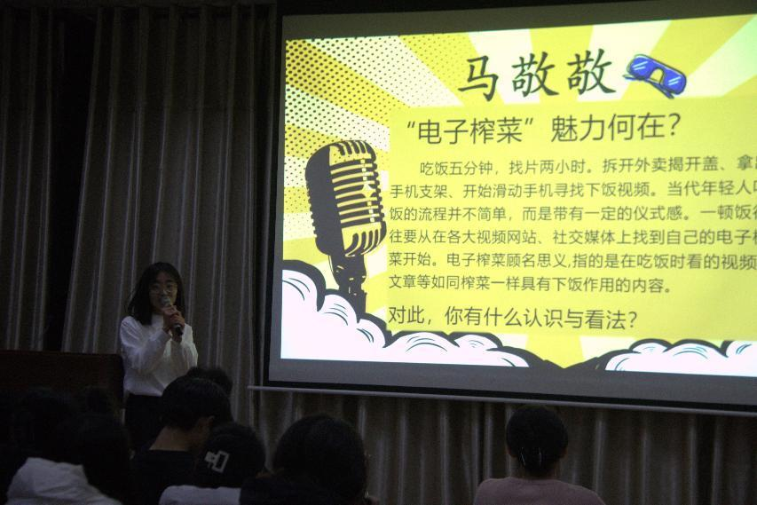 本次大赛共分为自我展示、即兴主持、情景模拟三个环节。自我展示中,每位选手都竭尽所能的去展现自己的风采,用自己清脆洪亮的嗓音与昂扬向上的精神为我们带来了一场又一场精彩绝伦的演说。传千年之经义,燃万古之明灯,周美琪的《历史“琪”说》将我们带进了历史的滚滚洪流;且听且忘且随风,且行且看且从容,在泛焦虑与反焦虑的主题上,李安媛的分析演说鞭辟入里。接着,各位选手在即兴环节凭借对时事的关注,妙语连珠,灵活应变,为我们带来了一个又一个精准深刻的热点剖析。最后,在一次次的模拟情境中,选手们从容不迫,坦然应对各种模拟的突发状况,发出了中国新一代青年的青春强音。