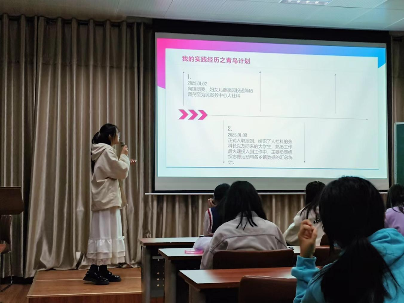 为深入贯彻落实党的二十大精神,引导和帮助广大青年学生在社会课堂中受教育、长才干、做贡献,学院于4月15日在千佛山校区1201报告厅举办“笃学善思,履践致远”社会实践分享交流会。本次分享交流会由学院团委举办,邀请到李宸宇、张晓宇、孙亚亭等八位社会实践优秀成果代表分享交流实践经验。