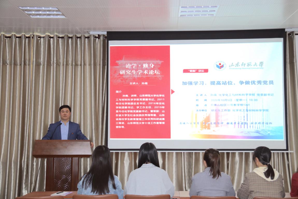 10月5日上午,由校党委研究生工作部主办,化学化工与材料科学学院承办的“治学•修身”研究生学术论坛在千佛山校区1201报告厅成功举行。本次论坛邀请了学院党委副书记孙南作了题为“加强学习,提高站位,争做优秀党员”的讲座,本次“初心”讲坛旨在加强研究生党员思想引领、提升广大研究生党性修养。讲坛由研究生辅导员马巾晴主持,化学院近百名研究生党员参与聆听。