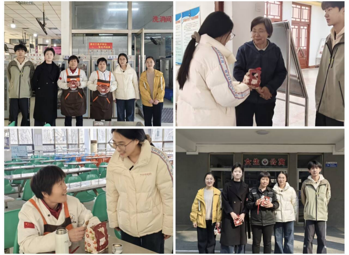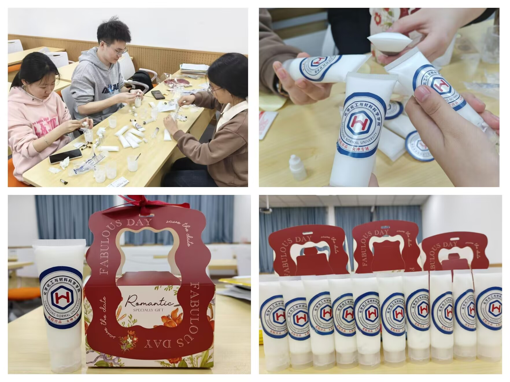 活动现场,学生们分组协作,严格按照配方称量甘油、橄榄油、乳化剂等原料,通过一系列规范操作完成乳化过程。除此之外,学生们还特别添加了维生素 E 和薰衣草精油,这样既保证了保湿效果,又赋予产品怡人香气。制作完成后学生们精心将这些承载着化学智慧的护手霜分装在印有学院院徽的可降解包装管中。3月8日当天,志愿者将这份饱含着满满心意与专业巧思的礼物送到老师餐厅宿管阿姨等女性教职工手中。