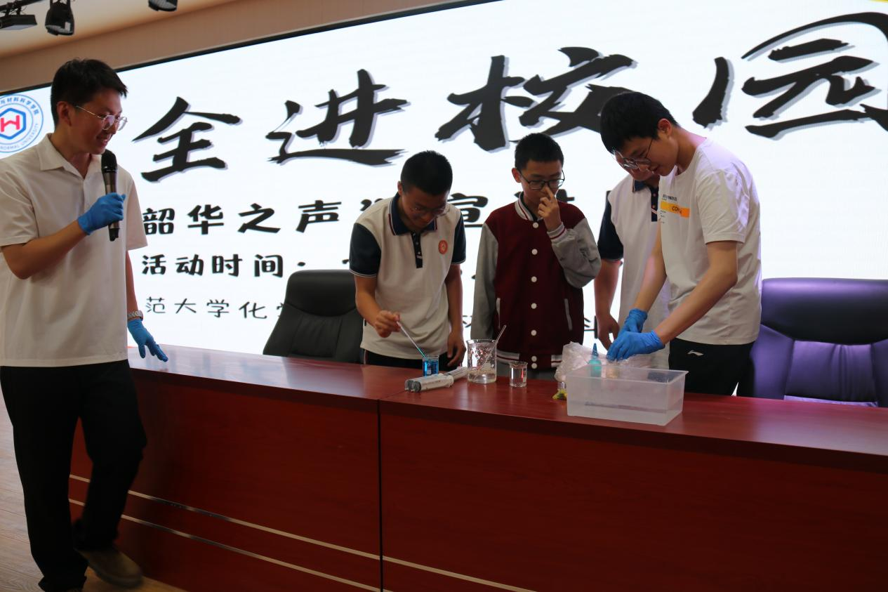 宣讲团成员姜泓坤、徐梓皓以一场有趣的“化学面条”实验开场,并邀请同学们上台感受化学实验的魅力。通过直观的实验现象,向同学们展示了神奇的化学反应知识和化学安全的重要性,并提醒大家警惕化学实验中的安全问题。
