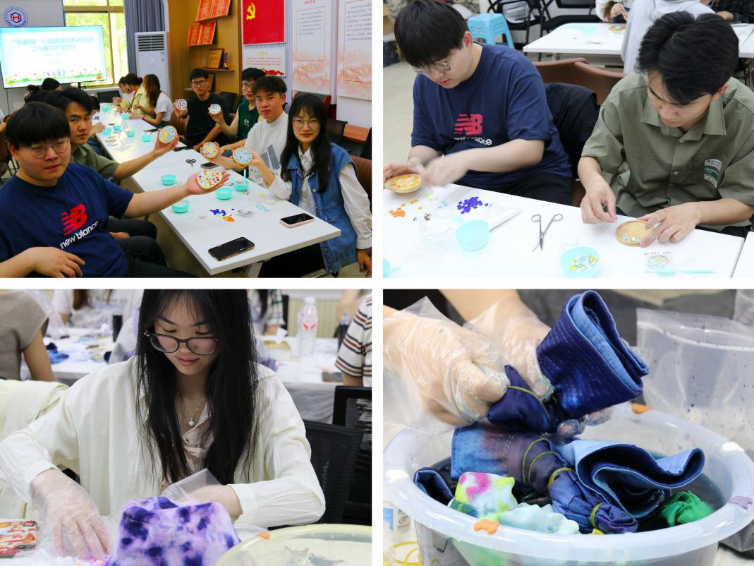 “多彩生活,创意马赛克杯垫DIY”手工制作活动中,研究生通过拼贴色彩与形状多样的琉璃块,发挥创造力的同时专注于每一个细节的搭配,获得了一件件独具匠心的艺术佳作。“遇见扎染,‘布’里生花”手工活动通过集体学习扎染的历史与文化、具体的操作技巧,将不同种类的物品进行折叠、捆绑,浸染颜料,让同学们享受动手制作的乐趣,沉浸在创作的快乐中,缓解了生活和学习中的压力。