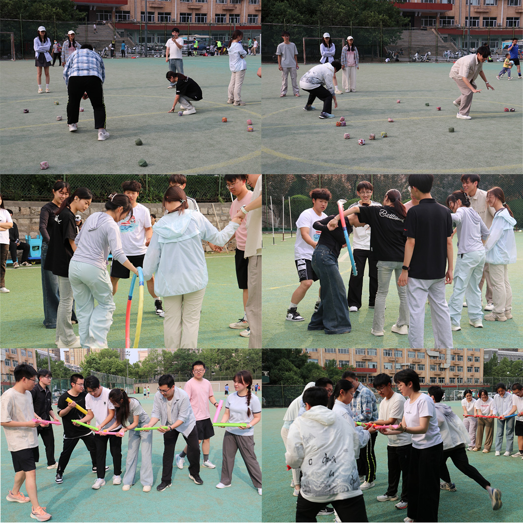 趣味运动会在裁判清脆的哨声中正式开始。采用师生组队的形式,项目丰富,趣味十足。传递呼啦圈环节,参赛队员们巧妙配合,让呼啦圈快速穿梭在队伍中;踢毽子接力时,大家各展身手,精准传递毽子,现场加油声此起彼伏;乒乓球接力中,团队成员们小心翼翼地移动道具,让小球顺利抵达终点,考验着彼此的默契;三人沙包活动中,队友间密切协作,展现出强大的团队力量;持杆绕柱项目,选手们灵活穿梭,全力以赴。