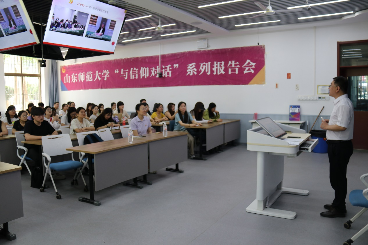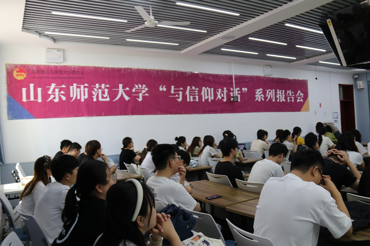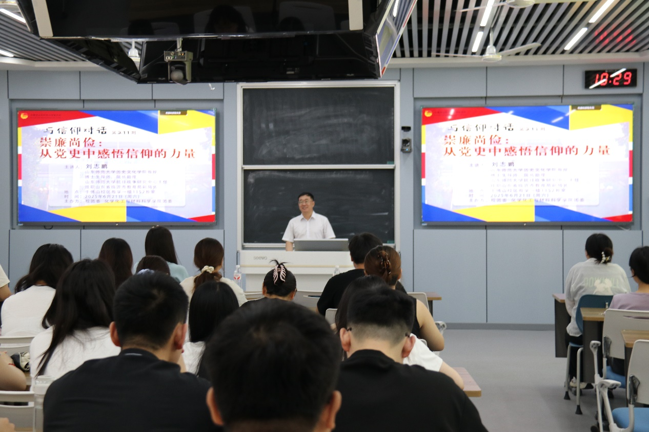 6月21日,校团委与学院团委于千佛山校区教学一楼1152教室共同举办“与信仰对话—崇廉尚俭:从党史中感悟信仰的力量”系列报告会。此次活动邀请山东师范大学历史文化学院教授、博士生导师、院长助理、山东师范大学抗日研究中心主任、山东省临沂市教育局副局长刘志鹏主讲,学院党委副书记、纪委书记魏宁出席活动,学院团委书记房超主持活动,团学骨干、入党积极分子八十余人参加活动。