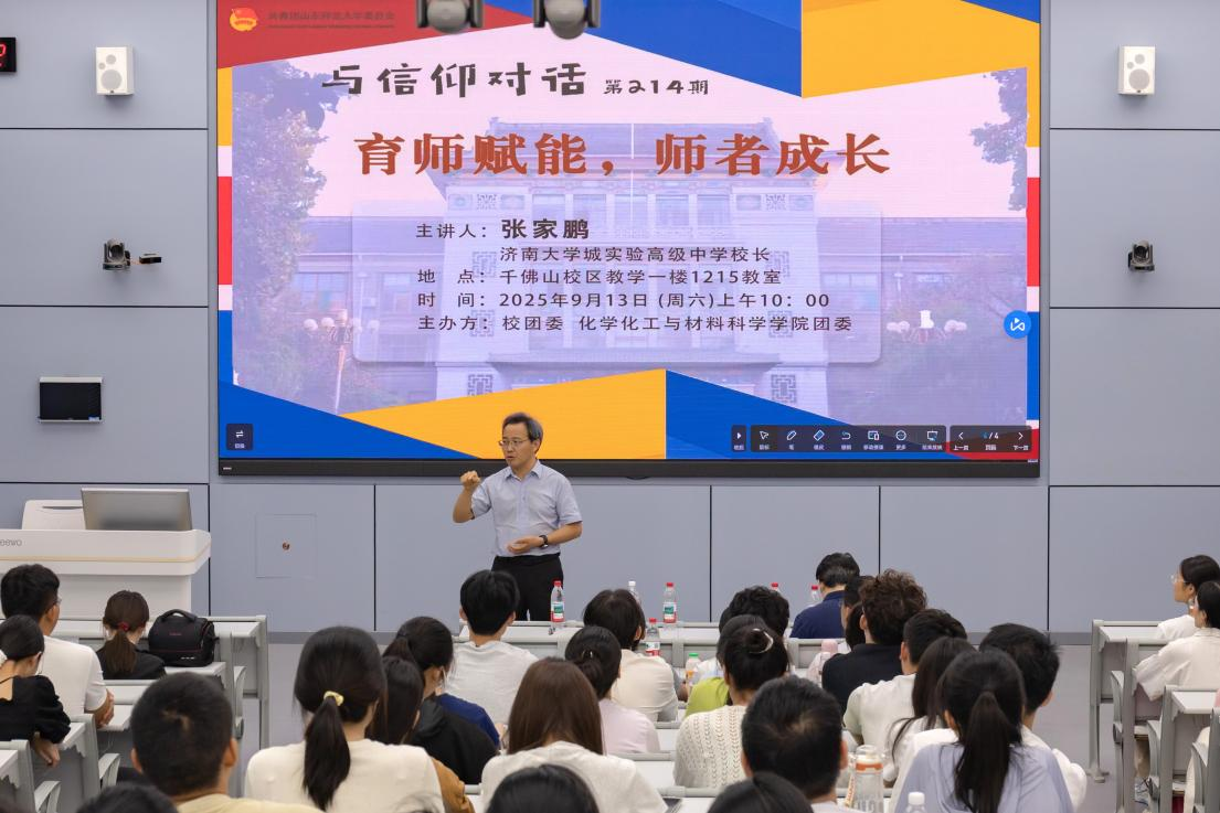 9月13日上午,学院于千佛山校区教学一楼1215教室举办“与信仰对话——育师赋能,师者成长”系列报告会,特邀济南大学城实验高级中学校长张家鹏围绕教师招聘与职业发展提供指导。