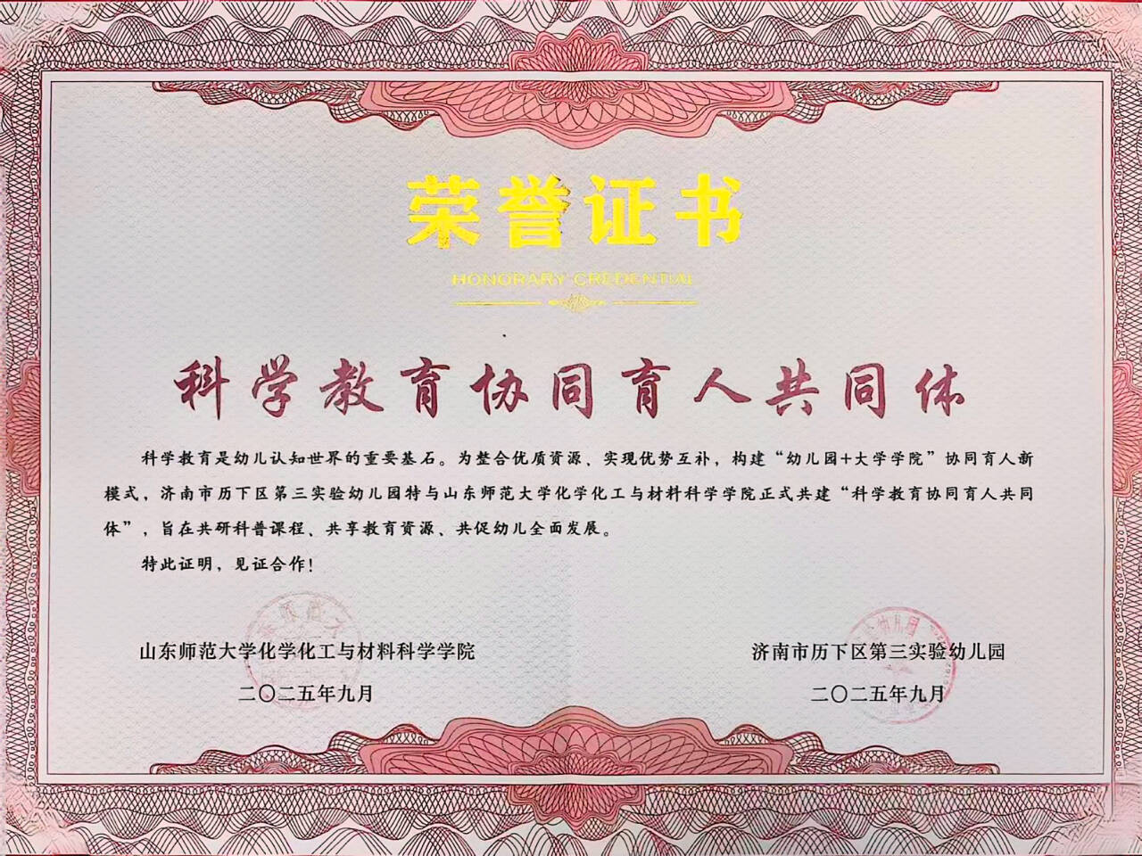 此次活动深化“大学生实践基地”建设的生动实践,济南市历下区第三实验幼儿园特与山东师范大学化学化工与材料科学学院正式共建"科学教育协同育人共同体",旨在共研科普课程、共享教育资源,共促幼儿全面发展。学院充分发挥化学专业优势,精准对接学前教育阶段的科学启蒙需求,既为大学生搭建了将专业知识转化为实践能力的锻炼平台,也为幼儿园的科学教育注入了新活力。未来,双方将以实践基地为依托,持续推动合作提质增效,为培养创新型人才、普及科学知识贡献更大力量。